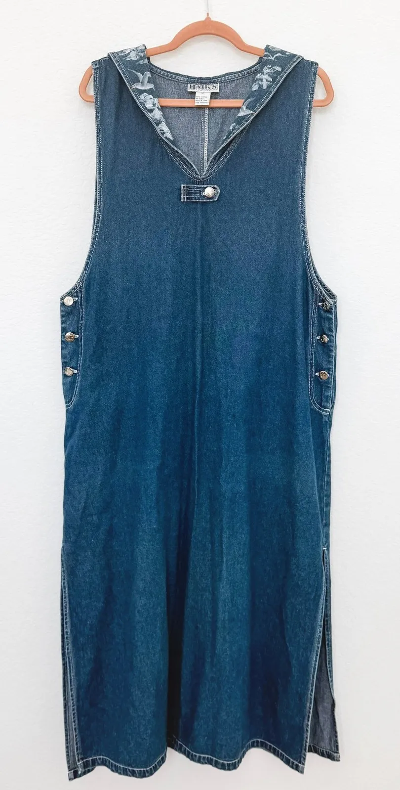 Haiks Womens Denim Jumper Dress Size XL Blue Embroidered Nautical Lighthouse VTG Coastal 100% cotton medium-wash denim jumper dress Back features hand-painted embroidered lighthouse and landscape scene Nautical-inspired sailor collar with floral embroidery Side button closures and anchor clasp at front Excellent condition. No visible flaws. See photos for details. vintage, coastal, nautical, denimcore, 90s style, Y2K casual, cottage coastal, lighthouse, seaside, soft vintage, retro Approximate Measurements (taken flat lay): Length: 48.5" Pit to Pit: 19" Ships next business day. Bundle deals available. Smoke-free home. Please check measurements before purchasing. SKU: 3127