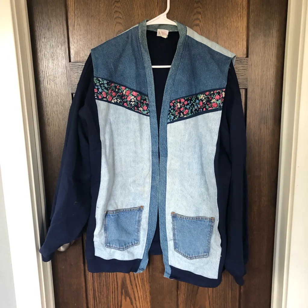 VTG hanes Aztec Southwestern Mix Media Custom Denim & Fleece Jacket Sweatshirt Large oversize Good... Show more