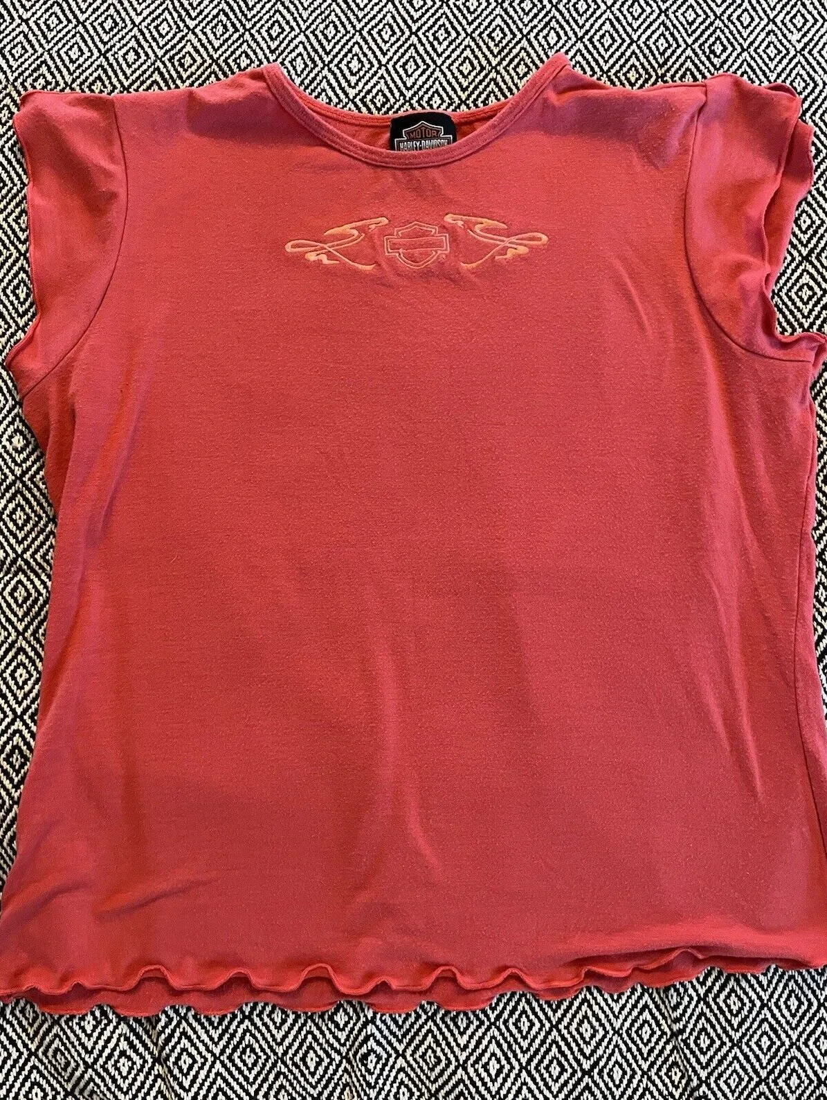 This vintage Harley Davidson shirt is a must-have for any biker enthusiast. The coral red color and embroidered accents make for a stylish yet casual look. The shirt is made of 100% cotton and is machine washable for easy care. The short cap sleeves and crew neckline with a pullover closure provide a comfortable fit. This T-Shirt is perfect for all seasons, whether you're riding your motorcycle in the summer or layering it under a jacket in the winter. Available in size L, this regular fit shirt is a basic style that will never go out of fashion. Smoke free and pet friendly home. Thanks for shopping by!
