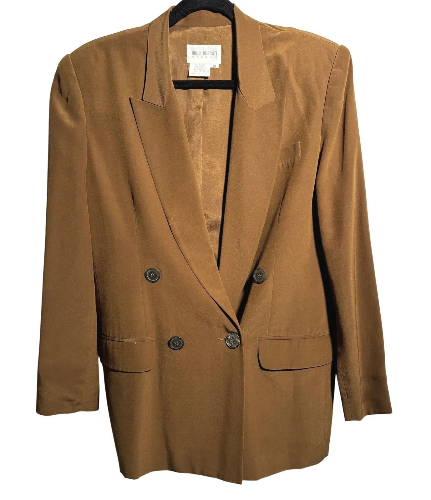 Measurements: • Chest across: 20.5 in • Length: 30 in Keywords: silk blazer, double breasted, tan jacket, womenswear, business casual, professional, classic, tailored, luxury, designer, Italian fashion, versatile, office wear vintage office siren lined shoulder pads 80s 90s chic minimalist Please see photos for details.
