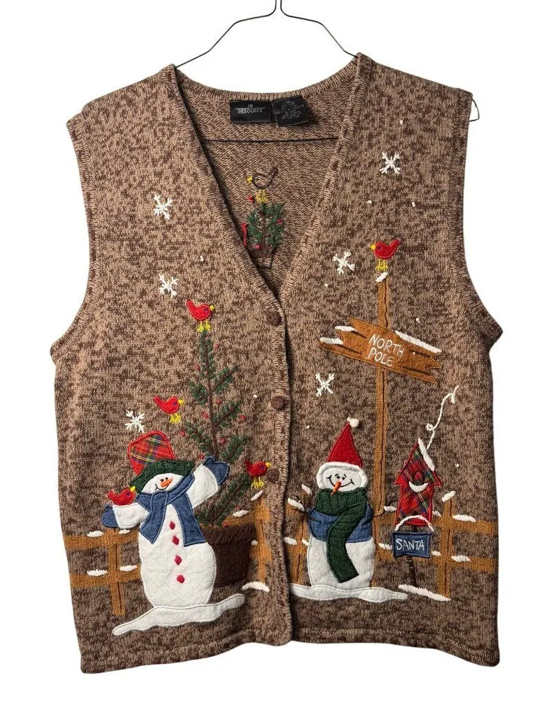 Vintage XL brown knit Christmas sweater vest featuring snowman and North Pole graphics. Cozy tacky grandma/grannycore holiday style, perfect for festive wear, ugly sweater parties, or cottagecore holiday outfits. ✔️ FEATURES • Vintage Christmas sweater vest • Snowman North Pole design • Ugly tacky holiday style • Perfect for holiday parties • Adds whimsical festive charm 📏 SIZE: Womens XL - ( Approx. Pit-2-Pit 21 x 25 Length ) ✅ CONDITION: some light fading and wear present , no rips tears or stains Vintage Christmas sweater vest, XL brown knit vest, snowman holiday vest, tacky ugly sweater, grannycore cottagecore vest, festive winter sweater vest, North Pole graphic vest, womens XL holiday top, cozy vintage sweater vest, retro Christmas vest, XL grannycore sweater, brown knit snowman vest, festive tacky holiday sweater, vintage winter layering top, snowman graphic vest, womens cottagecore holiday sweater, holiday party vest, XL Christmas knit, vintage festive clothing, whimsical Christmas sweater TAGS: #CozyHoliday, #SnowmanGraphic, #RetroChristmas, #WhimsicalSweater, #UglyChristmas, #Cottagecore, #SnowmanSweater, #Festivefashion, #winterfashion, #TackyVestSweater, #Sweaterweather, #holidayattire, #snowdaystyle, #ChristmasLayering, #Casualwear, #CozyVest temp1