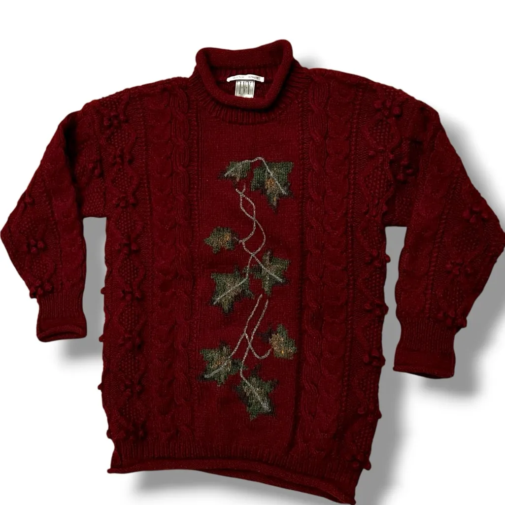 I.V.Y Hand Knit . Material - 100% Acrylic. Cable Hand Knit . Color – Burgandy with Multi-Color Embroidery Trim . Sleeve – Drop Shoulder/ Long Sleeve . Closure – Stand collar . Style – Tunic . Size – Loose Fit S As clothing sizes vary by Brand, Please compare your favorite garment laying on the flat to our measurements. Please enlarge photos for details. Measurements approximations taken Laying Flat, UN-stretched *colors may vary due to lighting or viewing devices *we will ship FAST and with care