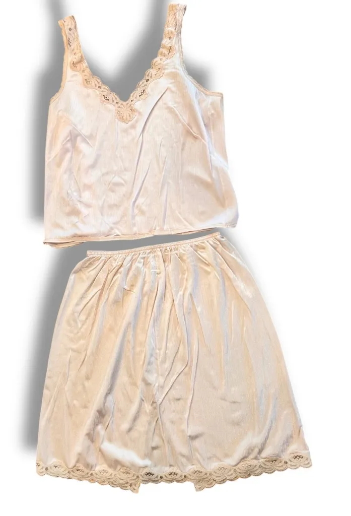 Vintage JC Penney light rose Nylon Lace Camisole and 1/2 Slip Set Lingerie Women's size large Measurements (approximately) see photos Adjustable straps Made in USA 100% Antron nylon Flaws: Iron mark (see last photo) #vintagelingerie #80s *remember that this is a genuine vintage piece and therefore may have some visible aging. Of course, we think this adds to the “cool factor” but please make sure to look at all photos carefully and be sure that you are comfortable with your purchase. *colors may vary due to lighting or viewing devices *we will ship FAST and with care