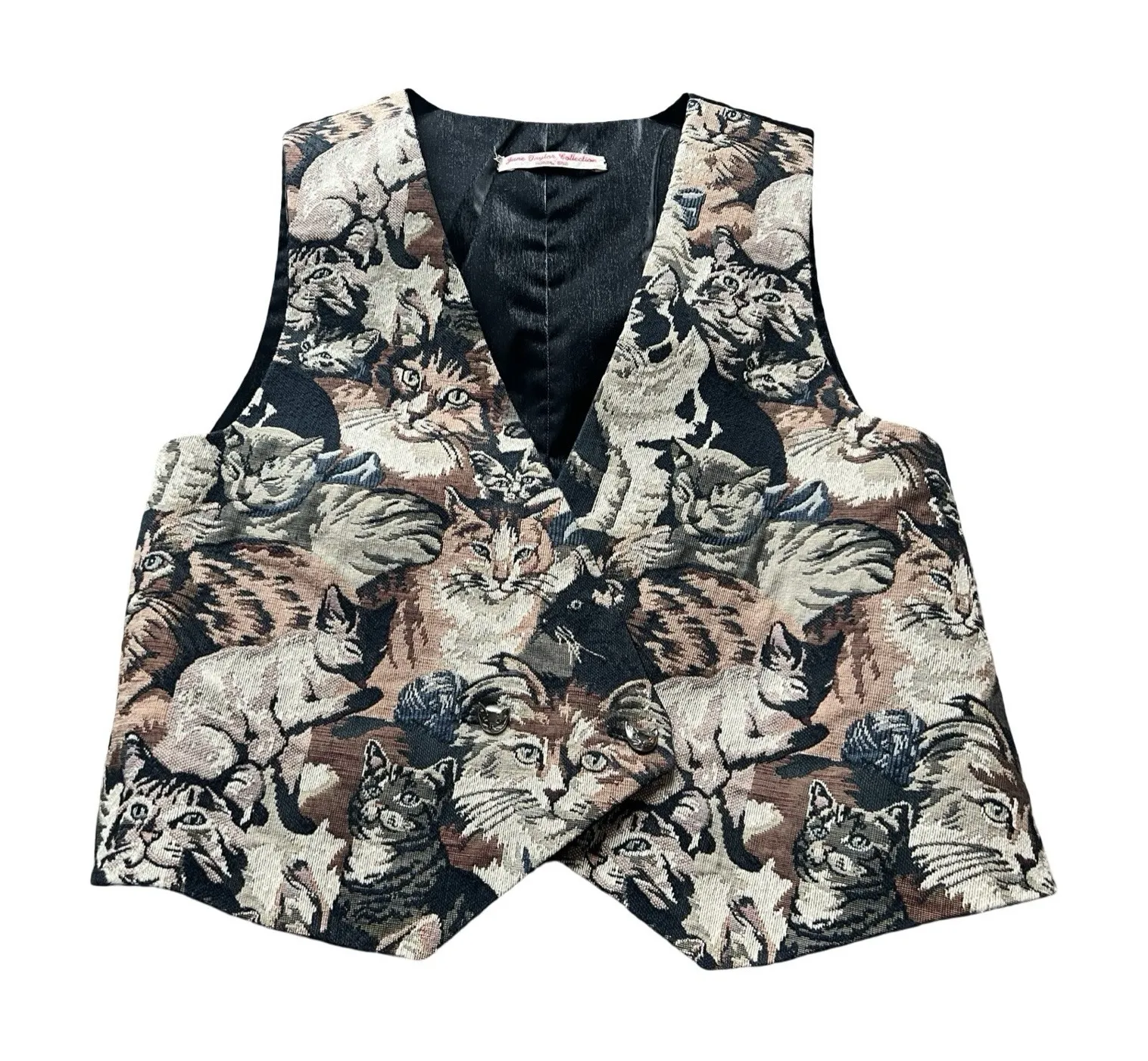 Vtg June Taylor Cat Tapestry Vest Kitty Feline Button Front Brown Black Size M - $35 - From Sam