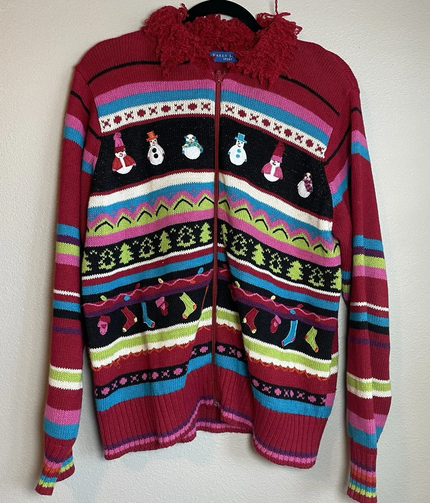 This vintage Karen Scott ugly Christmas sweater is a festive and cozy addition to any winter wardrobe. Made from a cotton blend material in a tight-knit design, the red sweater features a full zip for easy wear. The long sleeves and embroidered snowman, tree, and mitten socks add a playful touch to the Christmas-themed cardigan, perfect for holiday gatherings or casual wear. Machine washable for easy care, this sweater is a fun and unique choice for the colder seasons. Approximate measurements: pit to pit 22”, waist 44”, length 25”.