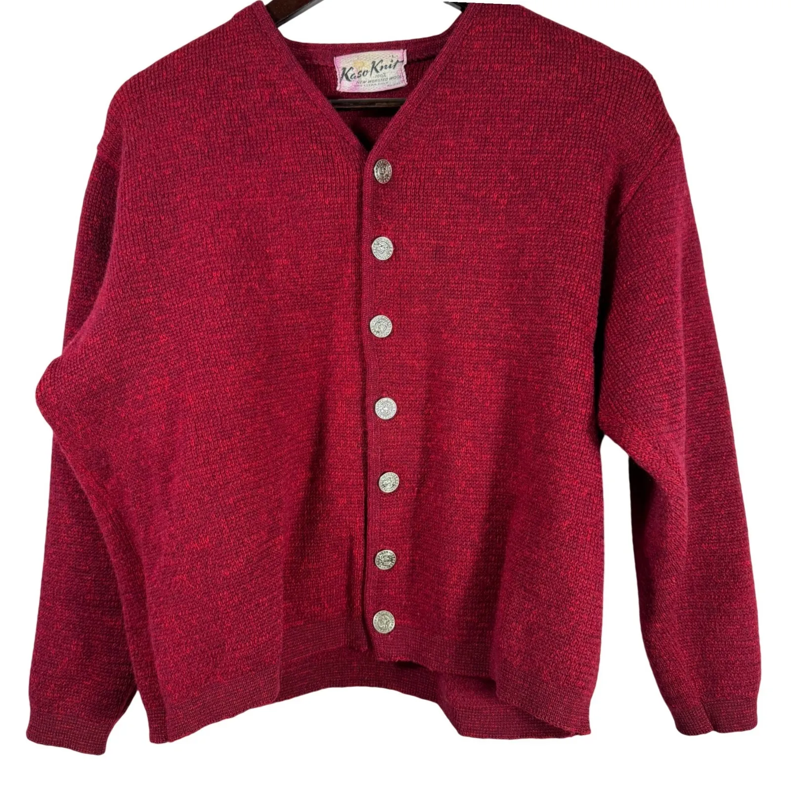 Classic vintage cardigan by Kaso Knit, crafted from 100% new worsted wool and made in the USA. This piece features a rich burgundy color, a flattering V-neckline, and distinctive decorative silver-tone metal buttons that add subtle character and charm. Approximate Flat Measurements • Pit to pit: 23" • Length: 22.5" Material & Care • 100% New Worsted Wool • Dry clean only • Made in USA Details • Button-front cardigan • V-neckline • Long sleeves • Decorative metal buttons • Soft but structured knit • Vintage construction • Era: Possibly 1970s Condition: Excellent vintage condition. No holes, stains, or repairs noted. Knit is sturdy with light, age-appropriate wear only. Vintage wool cardigan, Kaso Knit sweater, burgundy wool cardigan, made in USA sweater, metal button cardigan, mid century knitwear, classic wool sweater
