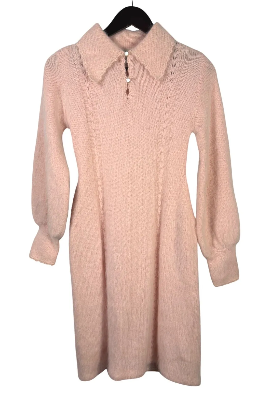 Brand: Kathy Paschalides for Petit Urge Era: Vintage (likely 1960s–1970s based on label style, angora knit, and silhouette) Color: Soft blush / pale pink Material: Angora blend (fabric tag missing — fiber identified by texture and halo) Size: No size tag — please see measurements Fit Estimate: Small to Medium (stretchy knit) Measurements (laid flat, approx.) • Pit to pit: 15.5" • Waist: 12.5" • Length: 37.5" Fabric has significant stretch and is designed to skim the body. Details • Ultra-soft angora knit with classic fuzzy halo • Feminine Peter Pan collar • Delicate pearl-style buttons at neckline and cuffs • Long sleeves with buttoned cuffs • Subtle vertical knit detailing for a flattering silhouette Fabric: Fabric tag is missing, but this dress clearly contains angora based on: • Distinctive fuzzy halo • Lightweight warmth • Soft, airy hand feel typical of angora blends Condition: Vintage, gently pre-owned condition. Light, even fuzz consistent with angora fibers. No major flaws noted. Please review photos closely. Vintage angora dress, fuzzy sweater dress, blush pink knit dress, 1960s style dress, 1970s knit dress, romantic vintage, cottagecore, soft girl aesthetic, balletcore, pearl button dress