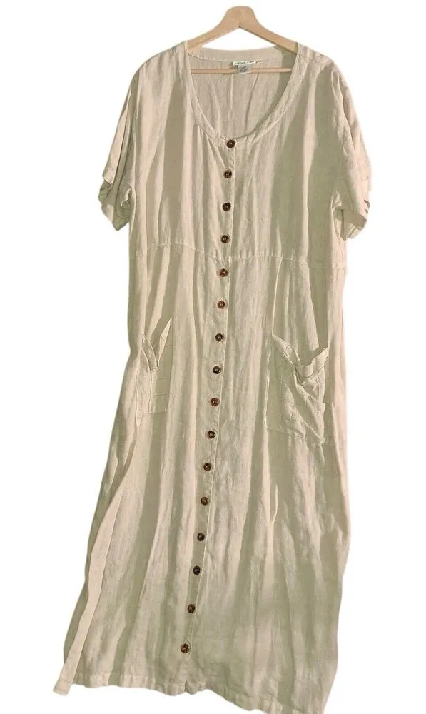 VTG Laissez Faire Creme Womens Cottagecore 100% Linen Button Down Dress Sz L Great Pre-Owned Condition (see pics for details) Size: Womens Large L Fabric: 100% Linen Super Fast Shipping: We ship within one business day. This vintage Laissez Faire dress in creme is a cottagecore style made from 100% linen with a button-down design. The long dress features a scoop neckline, short sleeves, and accents of buttons. It has a slimming fit with a drop waist and pockets for added functionality. Perfect for various occasions such as travel, weddings, parties, or everyday wear, this dress exudes a nostalgic charm with its vintage appeal and natural fabric, making it a versatile and stylish addition to your wardrobe.