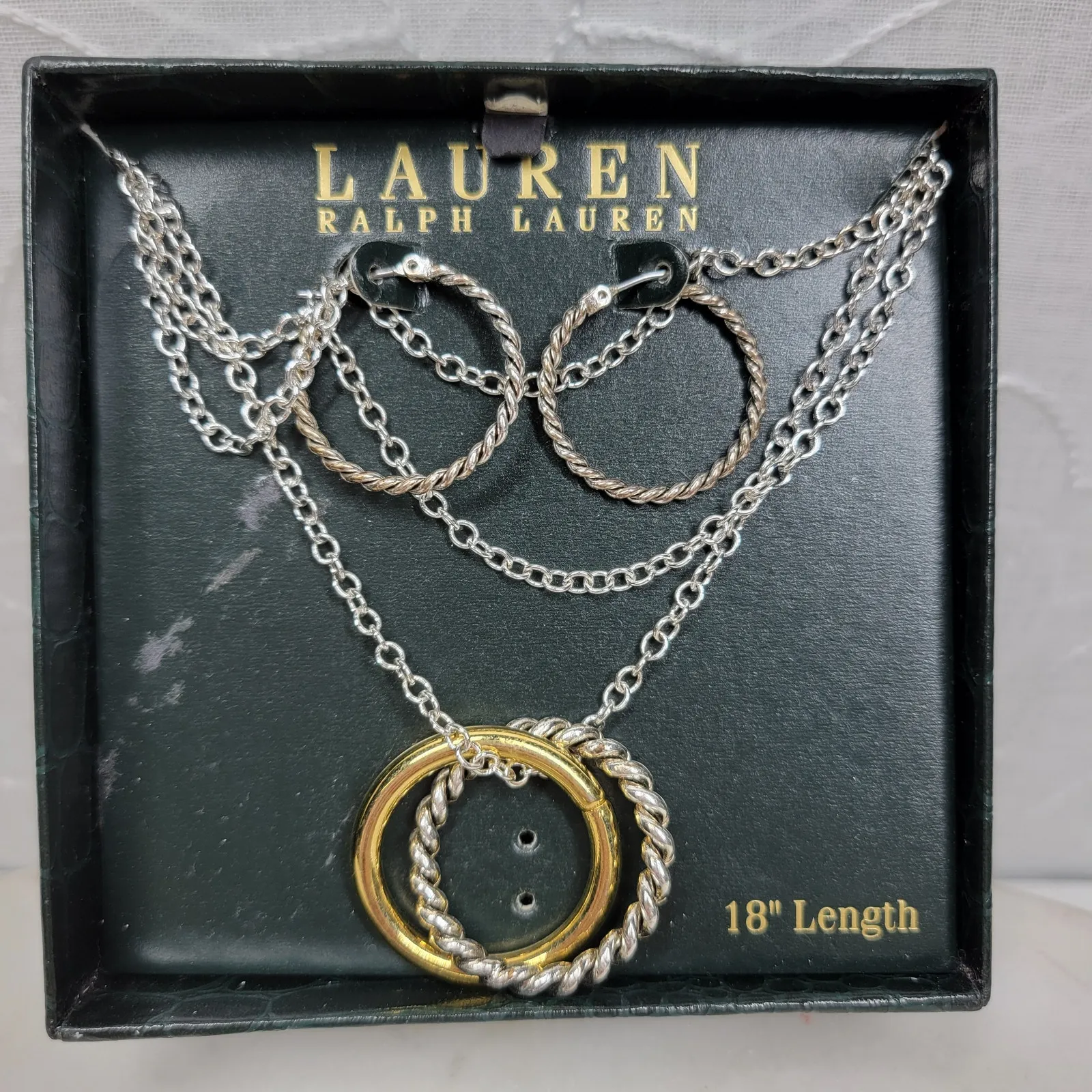 Brand: Lauren Ralph Lauren Type: Necklace & Earring Set Material: Mixed metal (gold & silver tone) Necklace Length: 18" Earring Style: Hoop Shop Policies & Vibes: • Orders ship same day if placed by 3pm EST (USPS mail days) • Clean, smoke-free environment • Most pieces are lovingly pre-owned and may show gentle wear • Irregularities marked with an * — most are minor or fixable • Questions? Ask away — I want you to love what you get! Thanks for shopping Anew Again Styles 💚 Condition: New with Tags (Deadstock, in box)