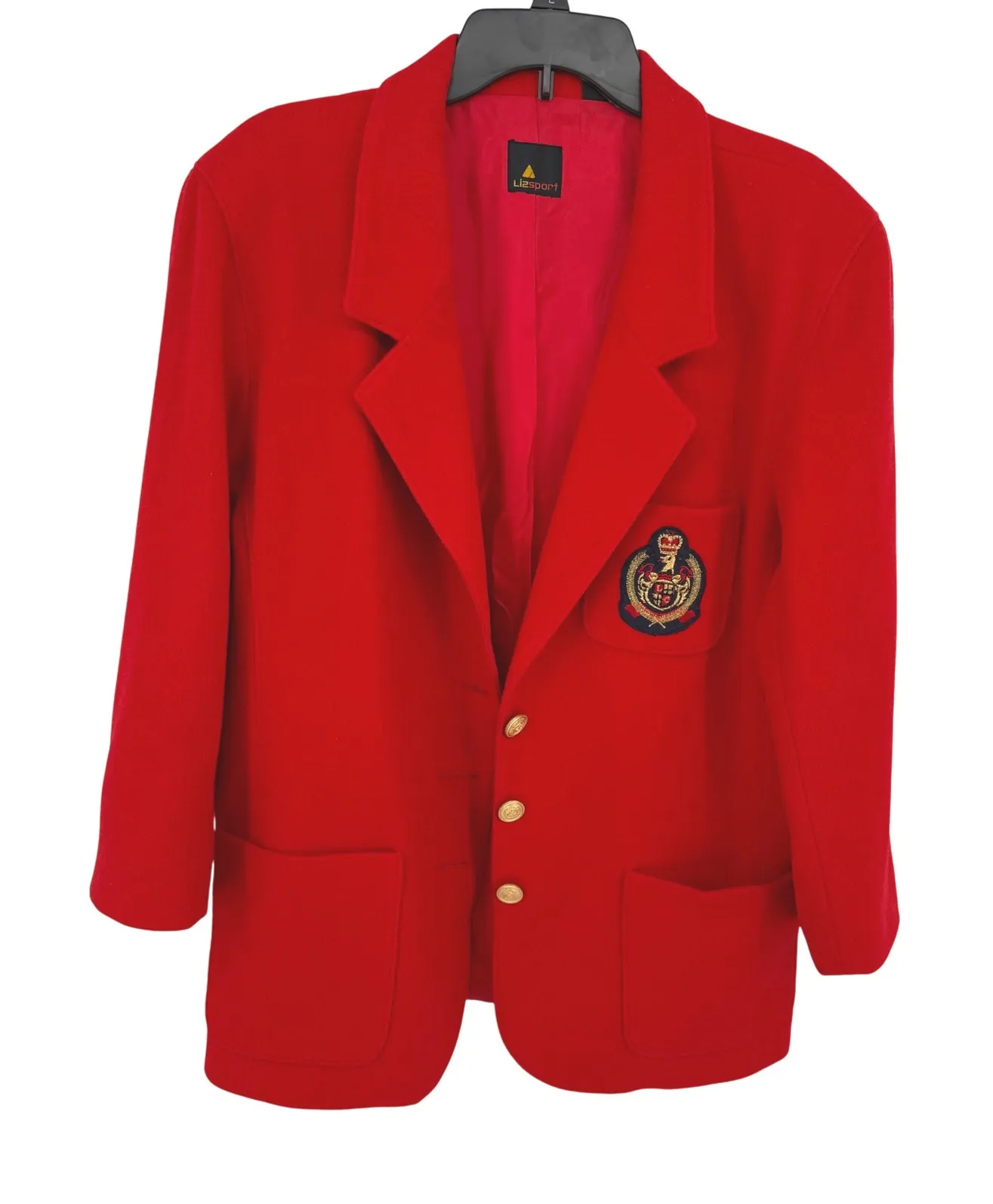 Excellent Pre Owned Condition No flaws Lizsport blazer in vibrant red. Classic notched lapel design with a single-breasted front secured by gold-tone buttons featuring an embossed crest. A distinguished crest patch adorns the left chest pocket. Fully lined interior for comfort and a polished finish. Perfect for a sophisticated office look or a stylish evening out. Measurements: lying flat • Chest: 23 in • Shoulder to Shoulder: 18" • Sleeve Length: 21" • Length: 32" Type: Blazer Outer Shell Material: Wool Style: Military Jacket Department: Women Lining Material: Polyester Accents: Logo, Embroidered, Button Features: Collared, Lined, Pockets Pattern: Solid Insulation Material: Wool Season: Fall, Winter Closure: Button Occasion: Casual, Travel, Workwear Sleeve Length: Long Sleeve Keywords: Lizsport blazer, red blazer, crest emblem, gold buttons, wool blend, tailored, preppy, academia, smart casual, business attire, statement piece, classic silhouette, vintage inspired, single breasted, old money, preppy, ralph lauren christmas vibes From A Smoke Free Pet Friendly Home All Questions & Offers Are Welcome 📦Always Ships Same Or Next Business Day