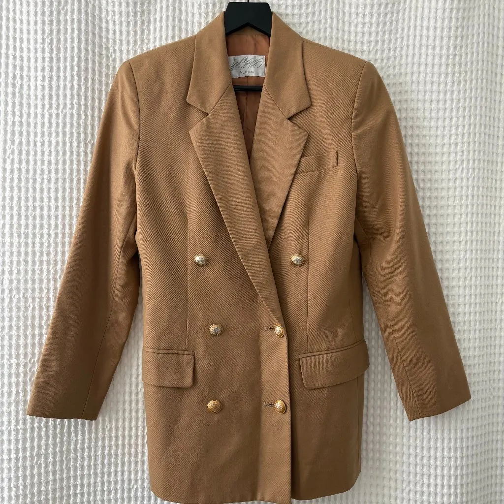 Vintage Lord & Taylor camel-colored wool double-breasted blazer. Functioning front pockets. Fully li... Show more
