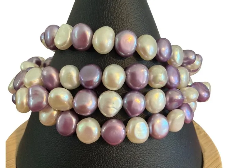 This vintage lot includes four elegant pearl stretch bracelets in lavender and white. Crafted from freshwater pearls, these bracelets offer a timeless touch to any ensemble. Perfect for estate jewelry enthusiasts. • Vintage pearl bracelets • Stretch design for fit • Lavender and white colors • Freshwater pearl material • Estate jewelry collection Sitting at 7" Weigh 42.94g Great preowned condition ****Stretch is very tight. May need to be restrung