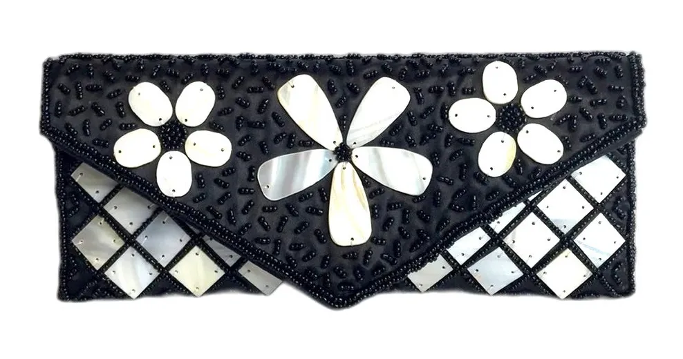 Vtg mad by design mother of pearl accents clutch black flower wallet - $30 - From Amber