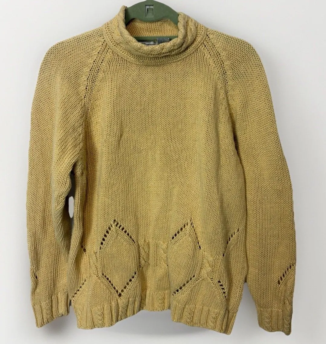 This vintage Maggie Lawrence women's sweater in size L is a stylish and cozy addition to your wardrobe. Made from a blend of ramie and cotton, this tight-knit sweater features a mock neck and long sleeves, perfect for casual occasions during the fall and winter seasons. The light yellow color adds a pop of color to your outfit, while the heavyweight fabric ensures durability and warmth. With a retro 90s theme and single pocket detail, this pullover sweater is a timeless piece that can be easily machine washed for convenient care. Measurements (approximate, from flat lay): Pit 21" Length 24.5"