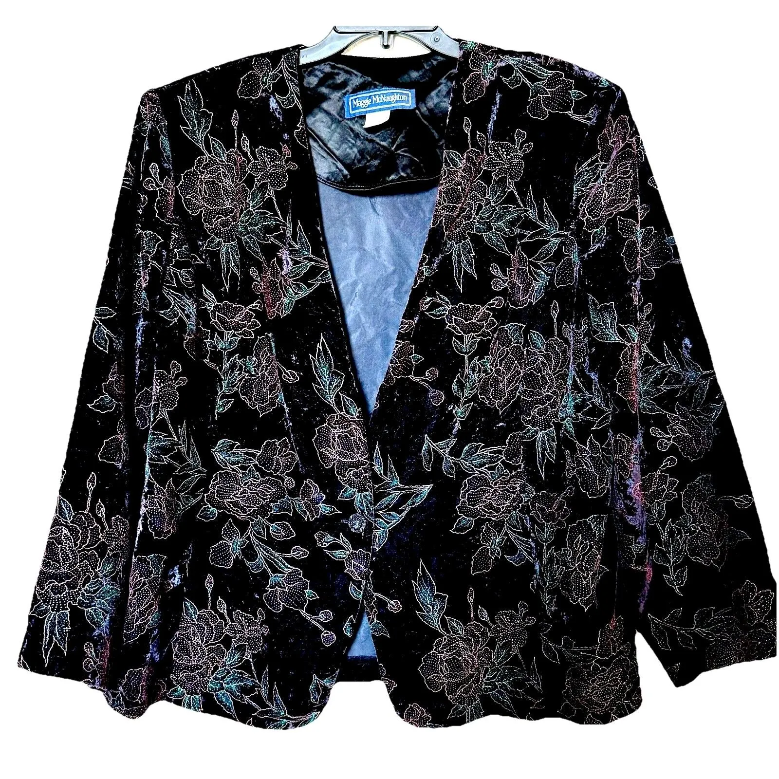 VTG Maggie McNaughton Blazer in Size 18W is a Velvet Black Jacket with Gold Thread accents, perfect for a party or a casual outing. This long-sleeve blazer features a button closure and shoulder pads for a classic f#velvet #vintage #plus #blazer