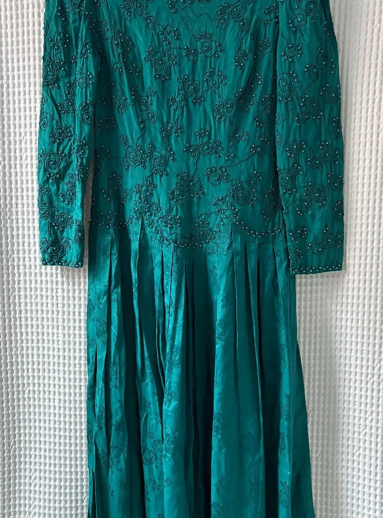 Teal 1980s beaded drop-waist special occasion dress from Marie St. Claire. Zips up the back. 100 percent rayon. Tonal floral design. Slight shoulder pads that could be removed. Marked a size 8, but it's more of a contemporary small; flat, it measures 18 pit to pit, the waist is about 16 inches, and it's 50 inches long as measured from the top of one shoulder to the hem.