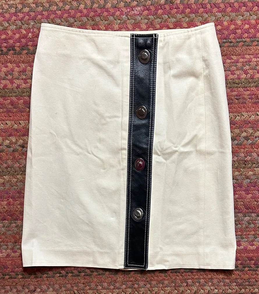 EUC. Genuine leather trim. Kisslock detail. Slight stretch. Waist 14” Hips 18.5” Length 21” What... Show more