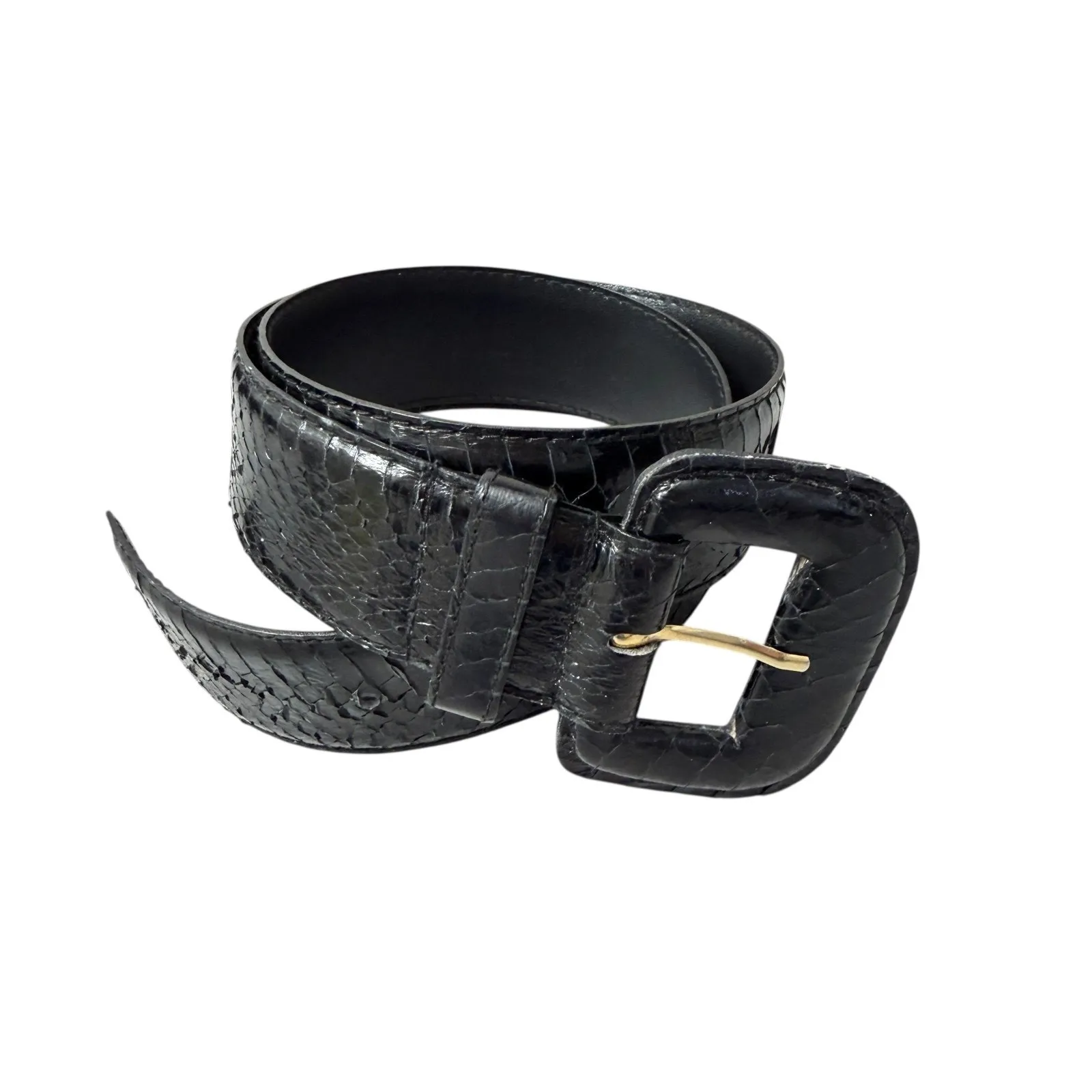 This listing is for a Vtg Morgan Taylor Snakeskin Belt. Black/Goldtone Prong. Approx 1.5in wide. Co... Show more