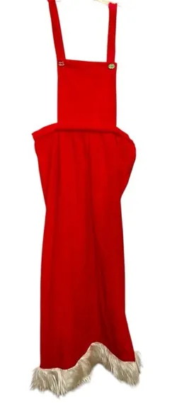 Handmade vintage Mrs Claus Red Velvet Bib Apron Dress with White Faux Fur lined bottom Adjustable suspender straps Slit for left leg Pocket on left side Decorative buttons at Front top (decoration only; straps currently secured with safety pins for greater stability and adjustment) Approximate measurements: 18” waist (36”) 18” shoulder to waist (as it is secured now; has +room for more length) 60” shoulder to bottom (as it is now + room) 31” strap (when measured end to end) 9.5” front bib from waist 40” waist down Women’s 36” waist generally = XL but as with all things go w measurements