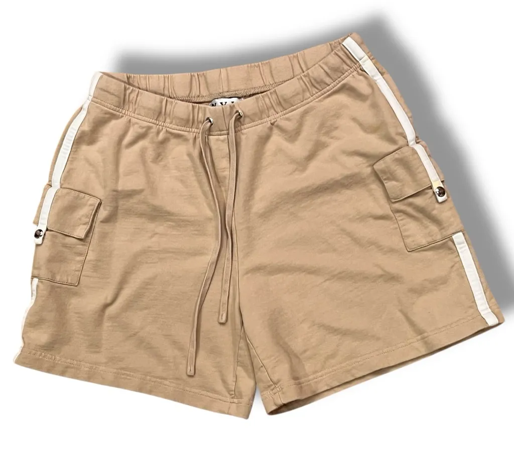Tan and white cargo sweatpant shorts. Good pre-owned condition. Has a small spot on back and around... Show more