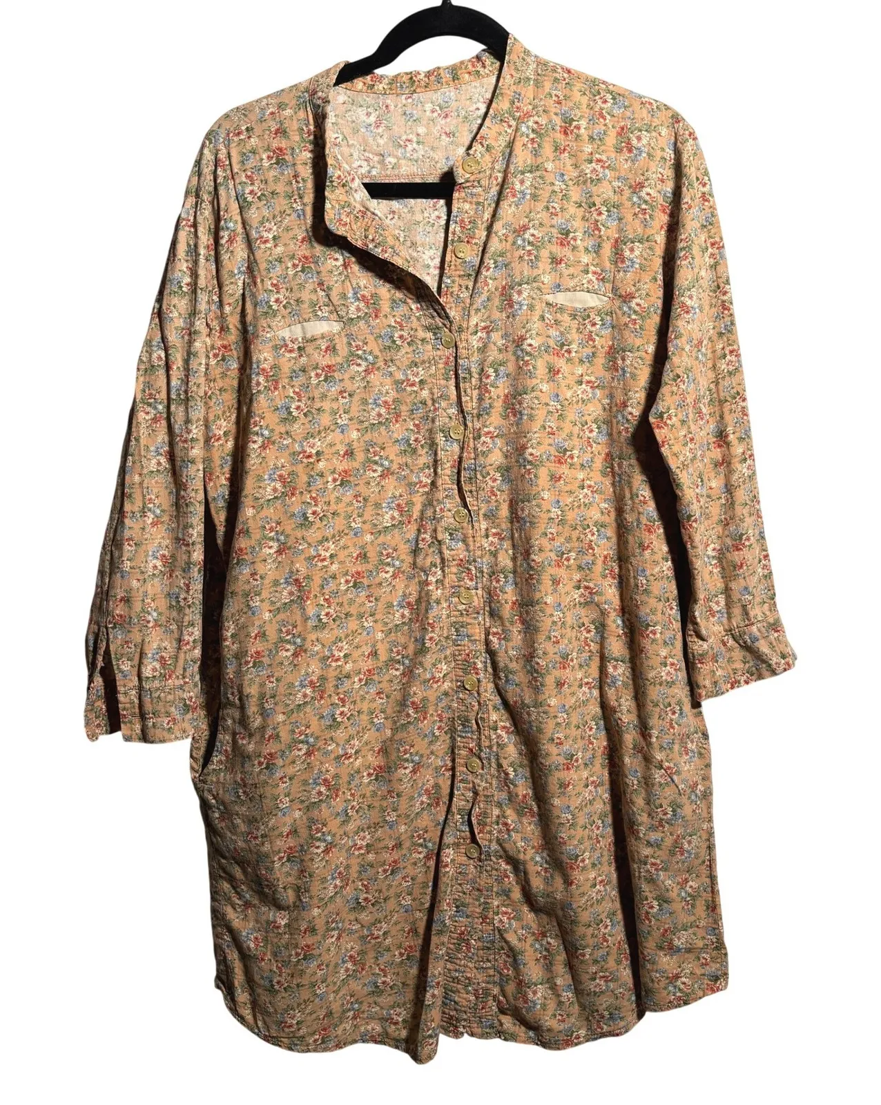 VTG Peach Disty Floral Button Up Tunic Shirt Dress Pockets XL Cottage Boho Measurements: • Chest ac... Show more