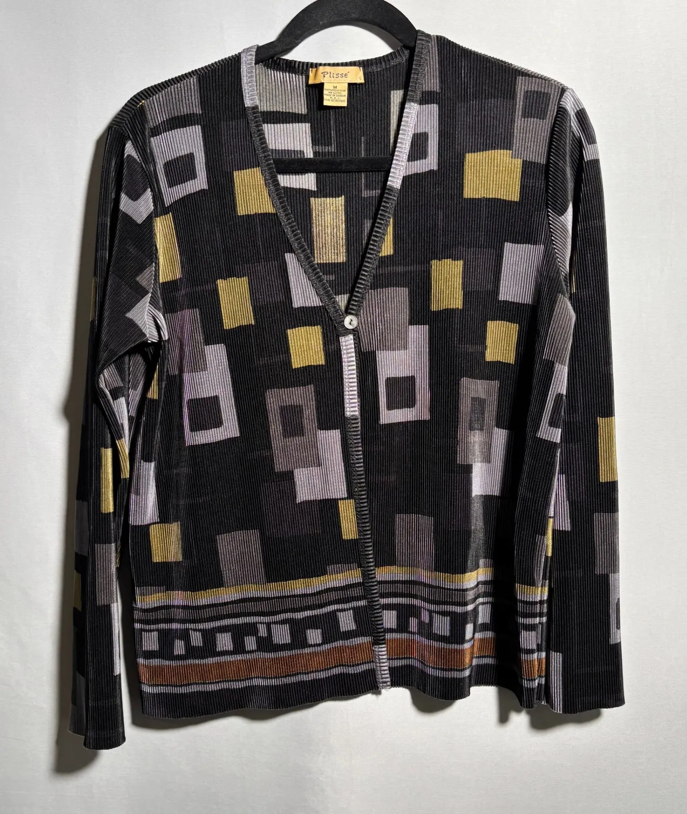 Measurements: • Chest (across): 22 inches • Length: 23.5 inches Keywords: Plisse cardigan, Geometric print cardigan, Black cardigan, Gold cardigan, Gray cardigan, Long sleeve cardigan, Size M cardigan, Vintage cardigan, Retro cardigan, Abstract print cardigan, Polyester cardigan, Women's cardigan, Casual cardigan vintage 90s y2k Please see photos for details.