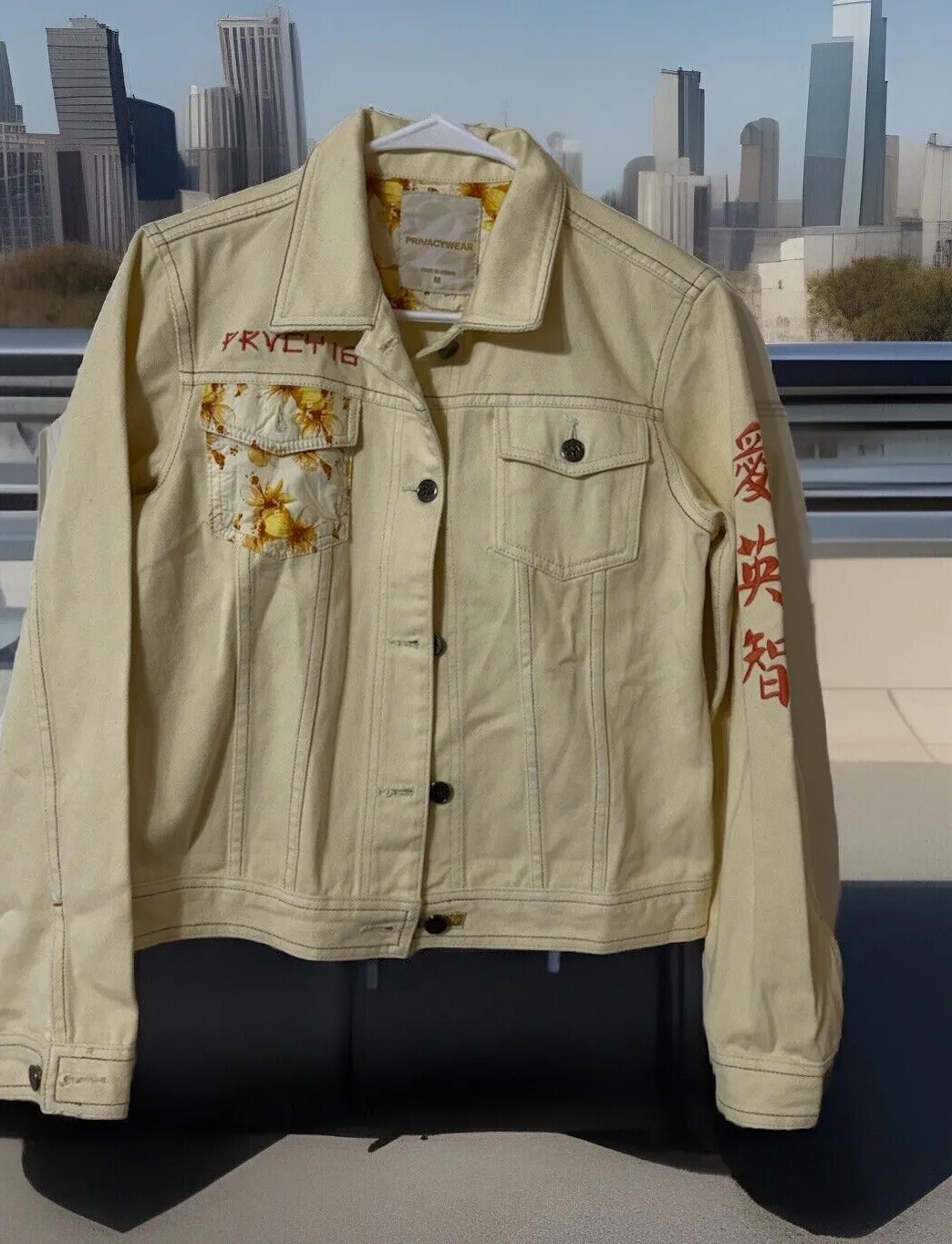 This vintage Privacy Wear women's denim jacket in size M features a cream color with embroidered floral accents in orange and brown, giving it a stylish and retro 90s aesthetic. The jacket has a waist-length cut and a button closure, made from cotton for a comfortable fit. This unique piece is a mix of classic denim jacket style with decorative floral elements, adding a touch of femininity to the design. Made in Korea Barely used excellent condition Measurements are proximately chest 18 Length 21 Sleeve 22
