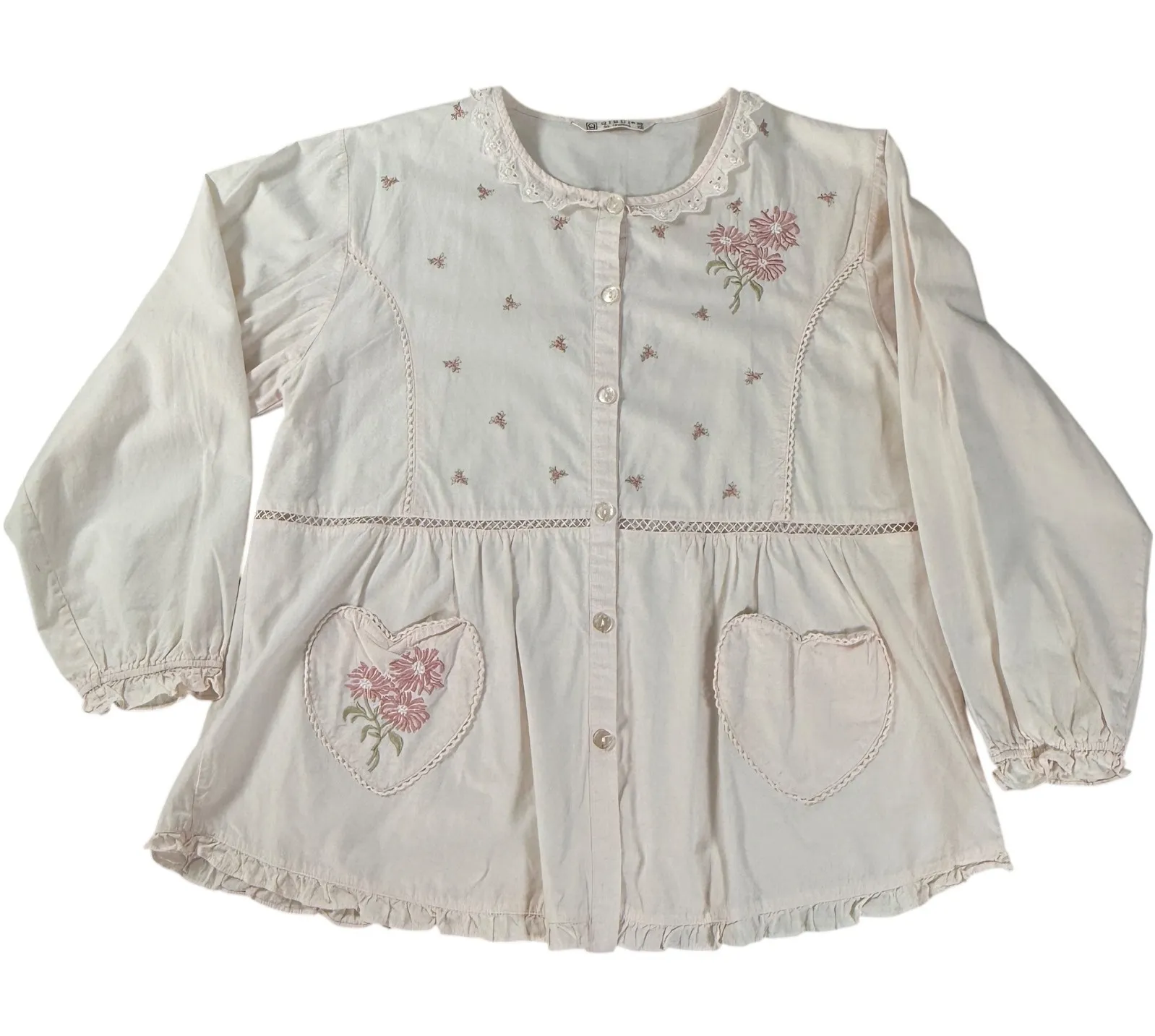 Excellent preloved condition Measurements: • Chest: 39 in • Length: 26 in • Waist: 26 in • Inseam: 23 in • Weight: 13 oz Keywords: pink shirt, floral embroidery, heart pockets, button up, long sleeve, feminine, cottagecore, shabby chic, sweet, whimsical, lightweight, casual, everyday
