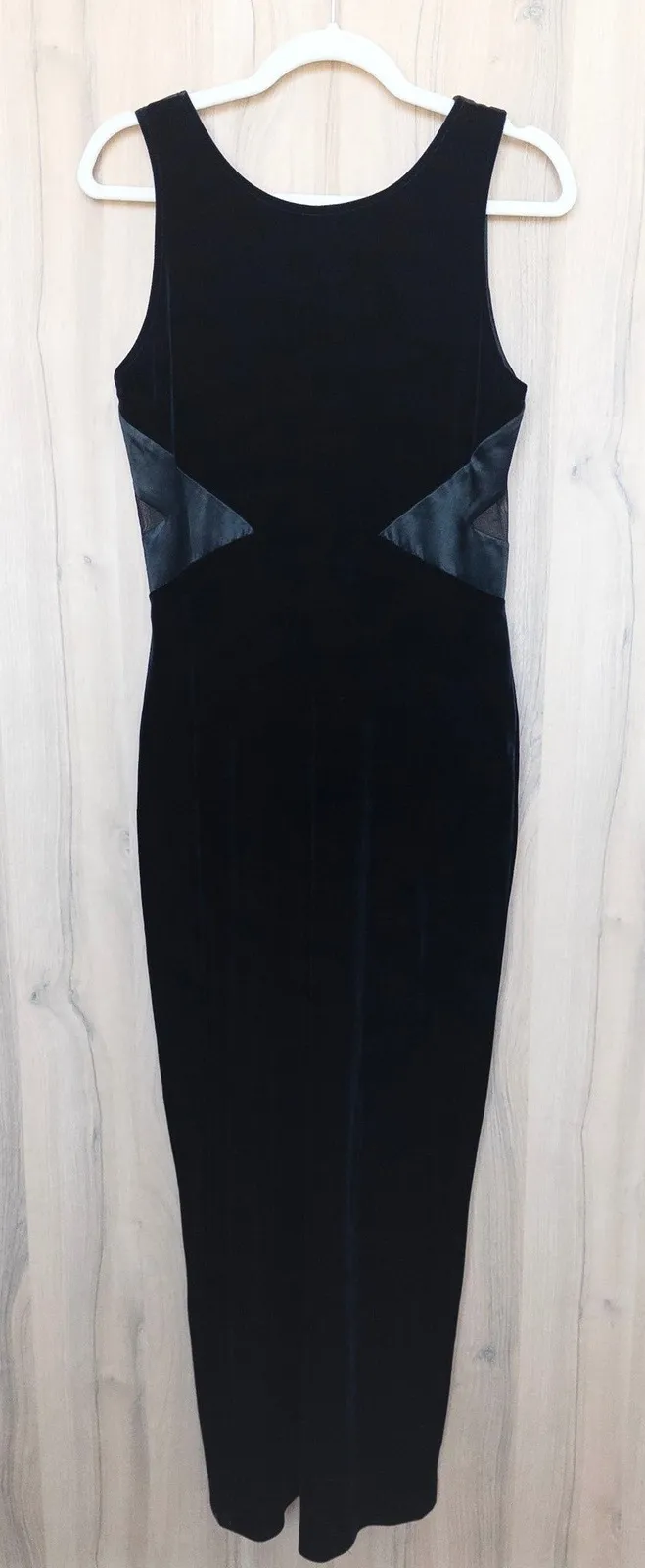 A sophisticated black velvet maxi dress by Rhapsody. This sleeveless dress features striking faux leather panel accents on the sides, creating a flattering silhouette. The back offers a subtle V-neckline with button detailing and sheer mesh inserts. Perfect for formal events, evening galas, or a chic cocktail party. Style: 90s vintage, y2k, minimalist chic, sculptural, evening glam, cocktail, old money, timeless elegance, sleek sophistication Approximate Measurements (taken flat lay): Length: 58.5" Pit to Pit: 17.5-20" Excellent condition. No visible flaws. See all photos for details. Ships next business day. Bundle deals available. Smoke-free home. Please check measurements before purchasing. SKU:3888
