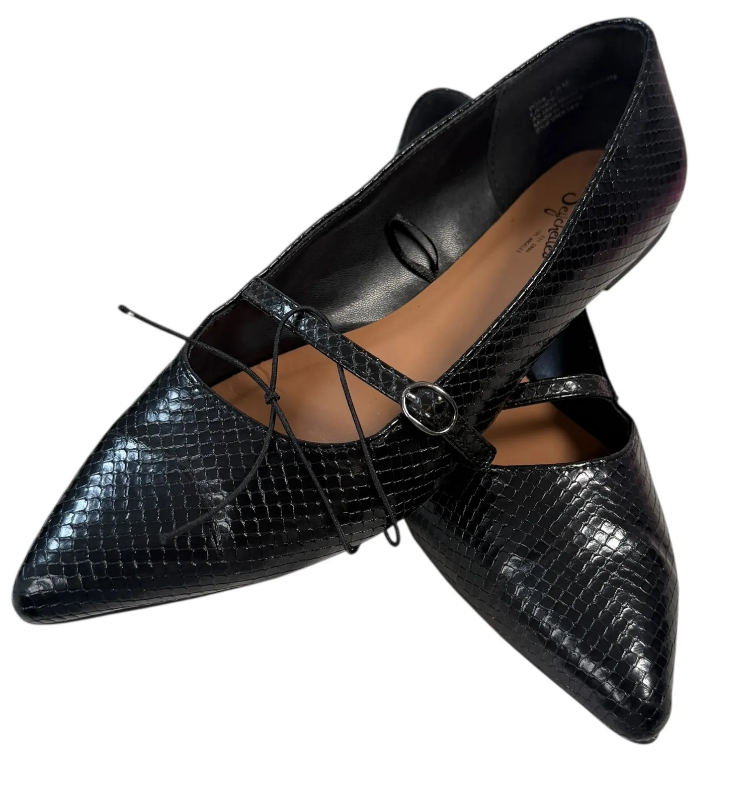 Condition: New without tags Weight: 11 oz Keywords: ballet flats, pointed toe, snakeskin print, mary jane strap, dress shoes, workwear, casual shoes, faux leather, black flats, comfortable, all man made materials