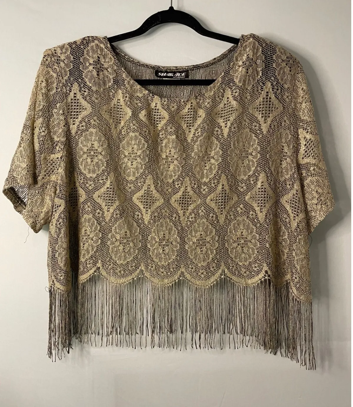 VTG Gold and black lace top with fringe detail. Open knit construction with a diamond pattern throug... Show more