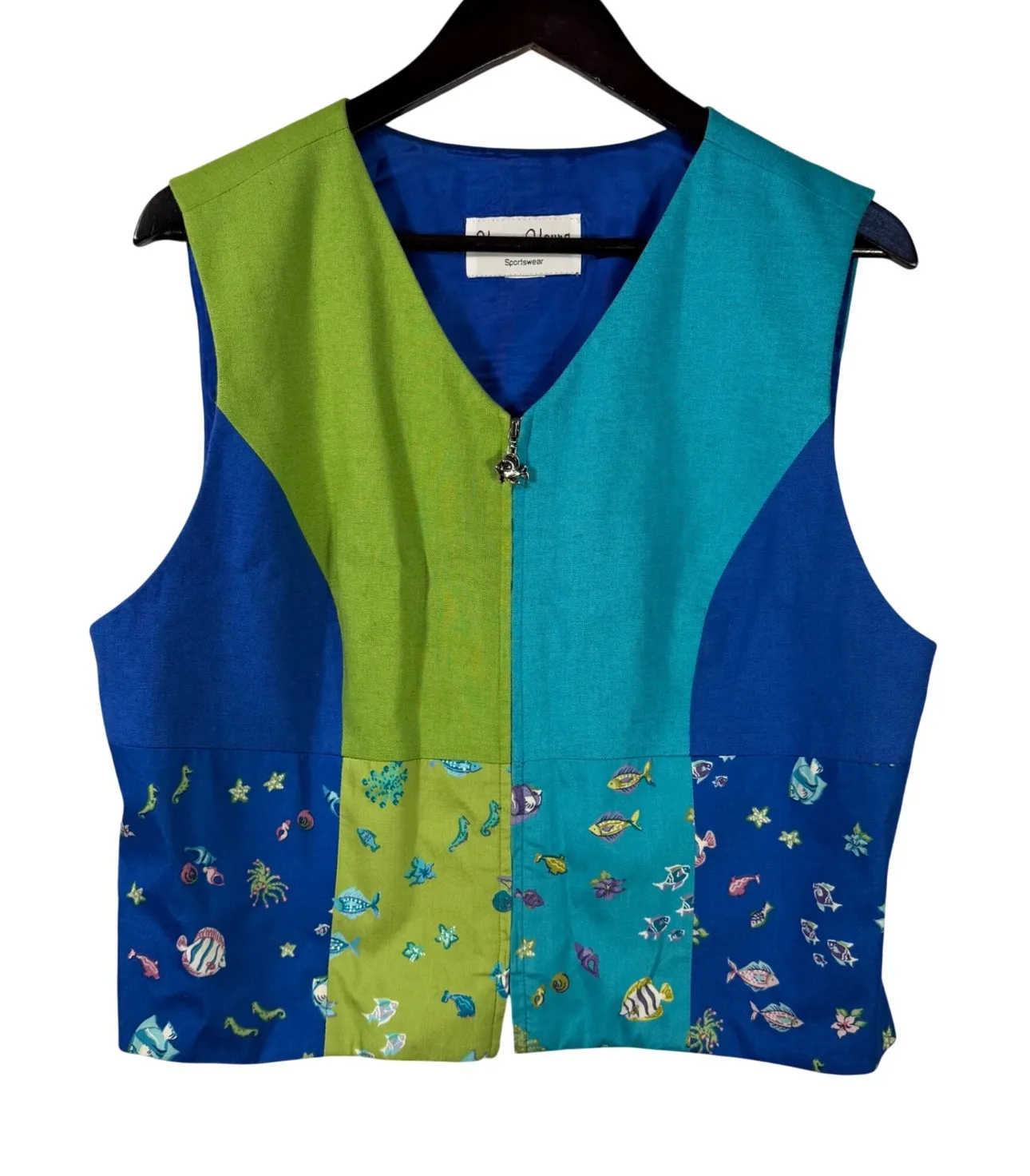 Eye-catching Sharon Young Sportswear vest featuring bold colorblock panels in shades of blue, teal, and green with a playful underwater fish print along the hem. Finished with a charming fish-shaped zipper pull, this sleeveless vest has a fun, artsy, coastal vibe that's perfect for layering. Measurements (laid flat) • Pit to pit: 21" • Length: 21" Fit Notes - no size tag: Fits like a Women's Medium to Large, depending on desired fit. Please refer to measurements for best accuracy. Sharon Young vest, fish print vest, novelty vest, coastal vest, colorblock vest, artsy vest, sleeveless zip vest, blue green vest, whimsical clothing, ocean theme vest