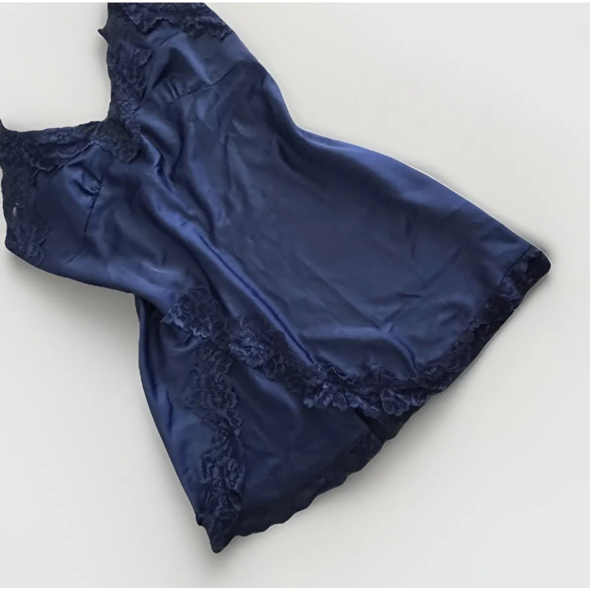 See Photos...deep v has been sewn up a little Chest 30 The VTG Slip Dress in dark blue floral broca... Show more