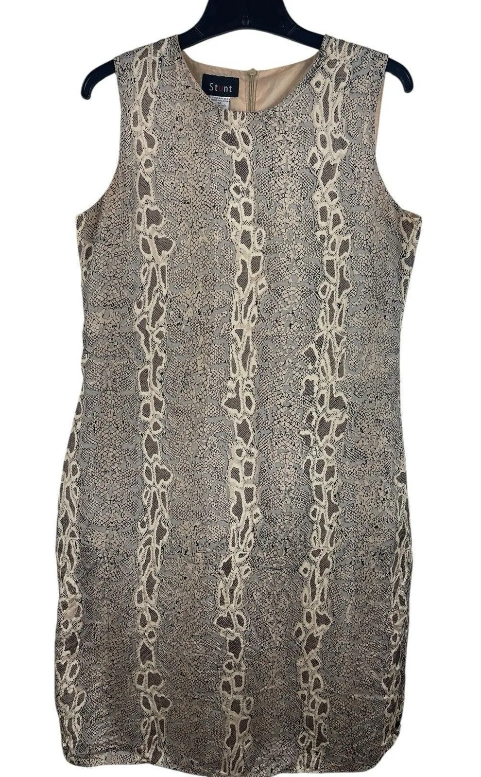 The VTG Stunt 100% Silk Dress is a stylish and versatile piece perfect for various occasions such as parties, casual outings, workwear, and business meetings. The dress features a unique snakeskin animal print pattern in vibrant colors, making it a statement piece with a touch of vintage flair. The sleeveless design, round neckline, and knee-length silhouette give it a classic and elegant look that is both lined and lightweight, making it comfortable to wear during the summer, fall, and spring seasons. Perfect for those who appreciate a blend of office chic and animal print trend, this dress exudes a sense of confidence and sophistication.