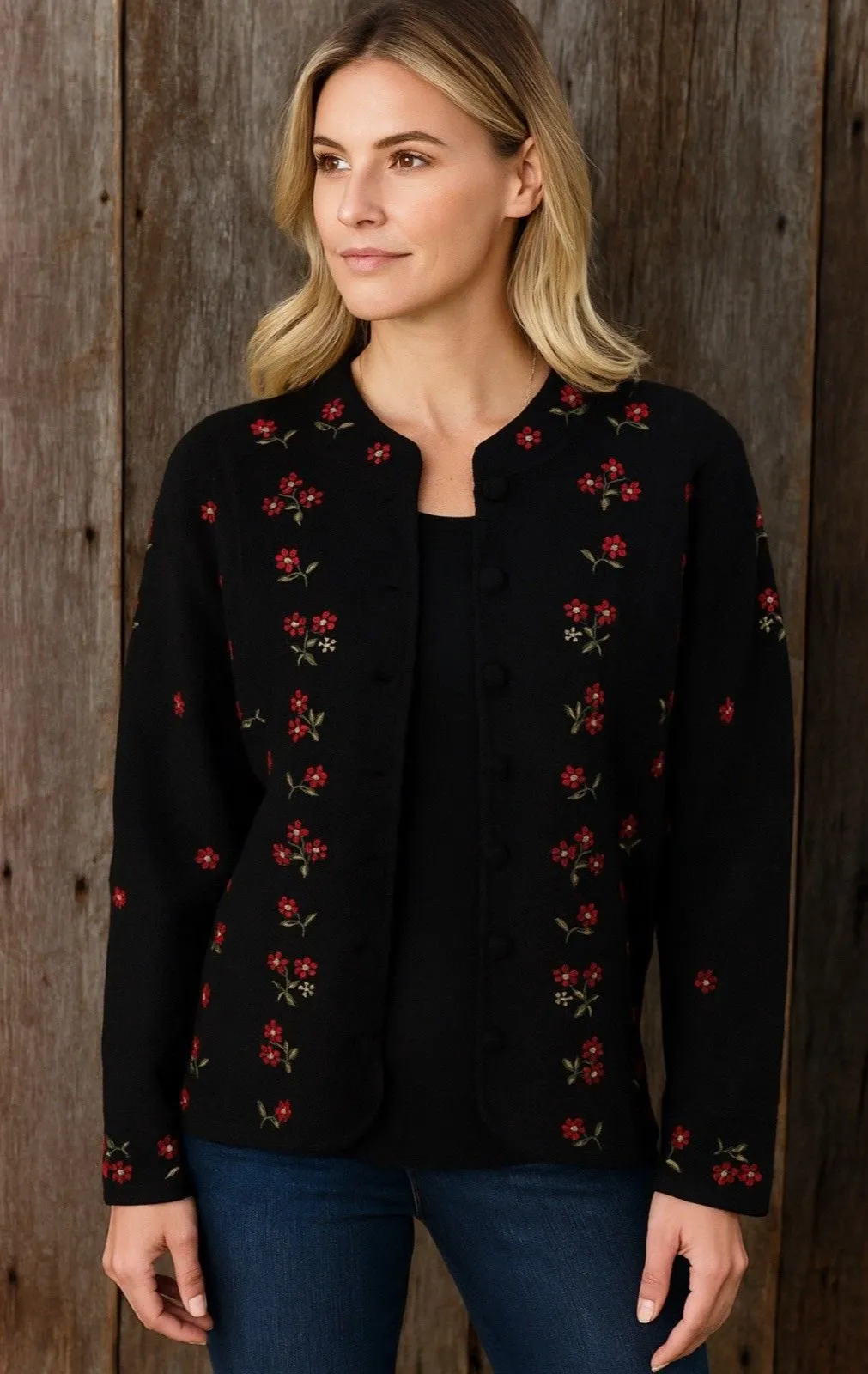 Vtg Talbots 100% Wool Cardigan Sweater Size L Embroidered Flowers Buttons Black Size L - $25 - From NiCole
