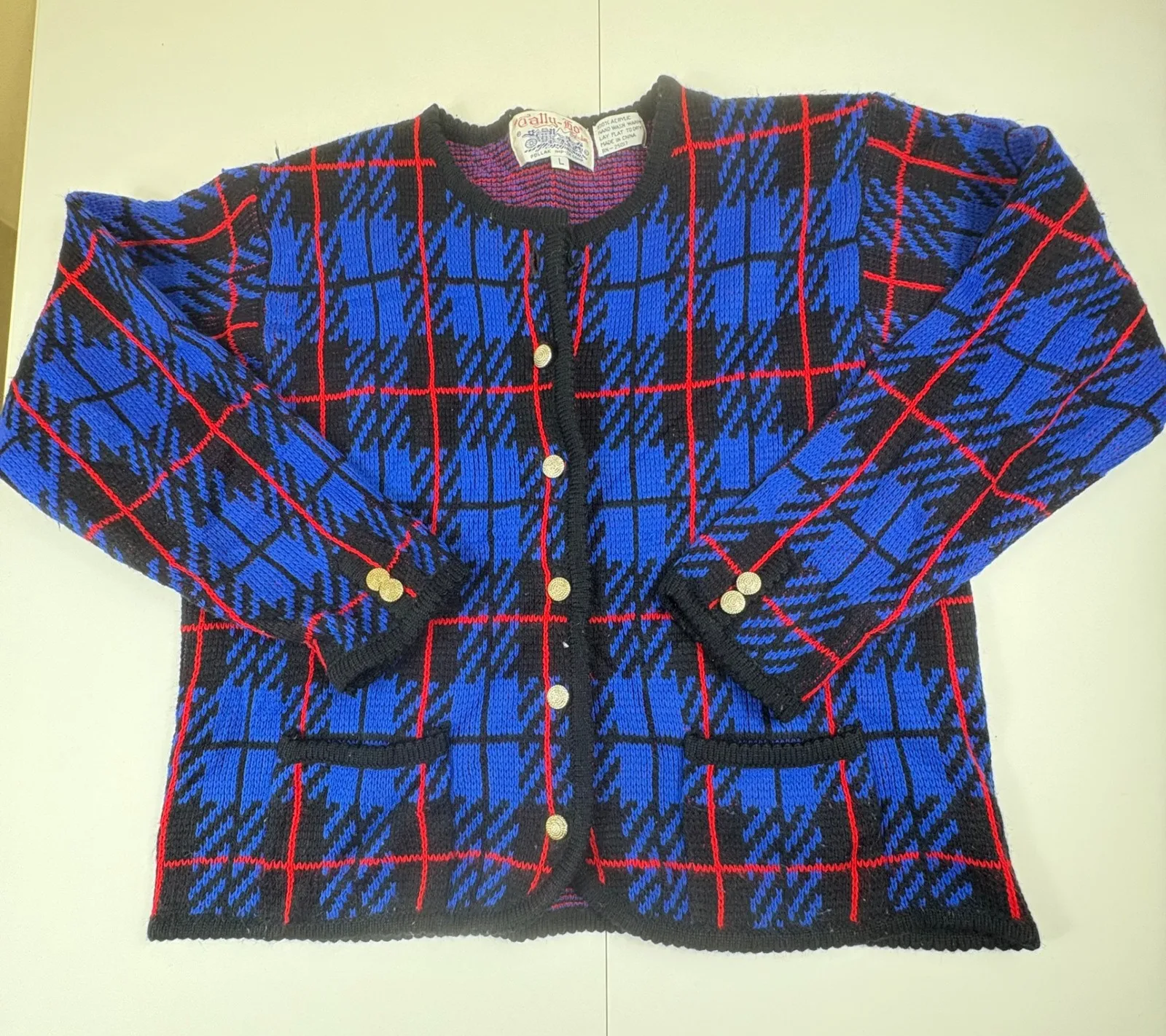 Tally Ho vintage-style plaid cardigan sweater in vibrant blue, red, and black with a bold houndstooth knit pattern. This button-front sweater features silver-tone buttons, with one original button currently attached using a safety pin. Two functional front pockets add practicality. The neckline is lined with a contrasting red and black striped knit for added detail, and the shoulders are structured with removable shoulder pads for that classic retro silhouette. Warm, cozy, and perfect as a fall/winter statement piece. plaid cardigan houndstooth knit vintage sweater retro style silver buttons statement knitwear academia vintage-inspired preppy sweater classic button up winter layering bold print knit cardigan structured shoulders shoulder pads 80s style patterned cardigan cozy warm knitwear