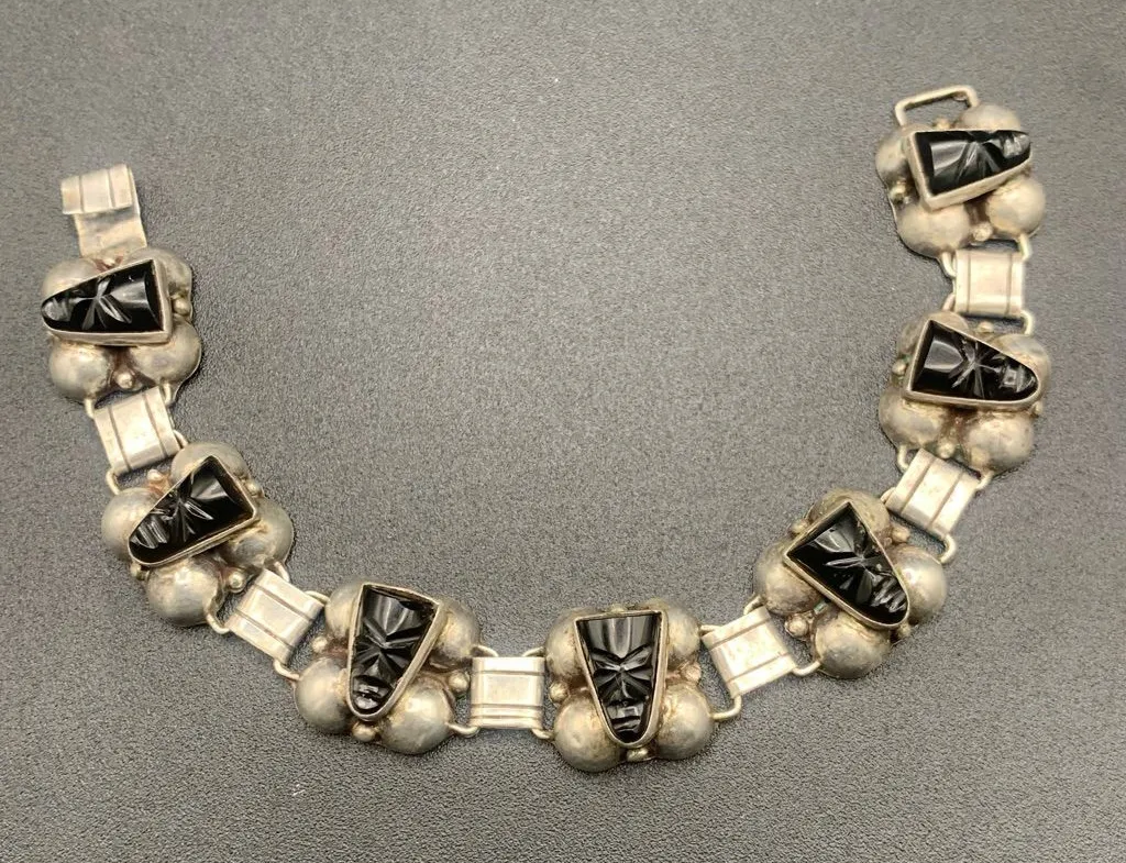 VTG Taxco Mexico Carved Onyx Aztec Face Bracelet Sterling Silver 7” Black - $109 - From Ashley