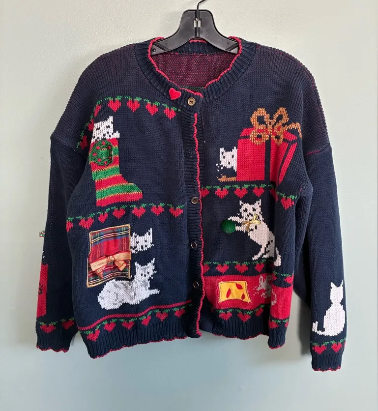 Charming sweater featuring playful cat and holiday motifs. Perfect for festive occasions. Please note it is missing a buttons and I’m assuming a heart on the collar but that’s a guess.