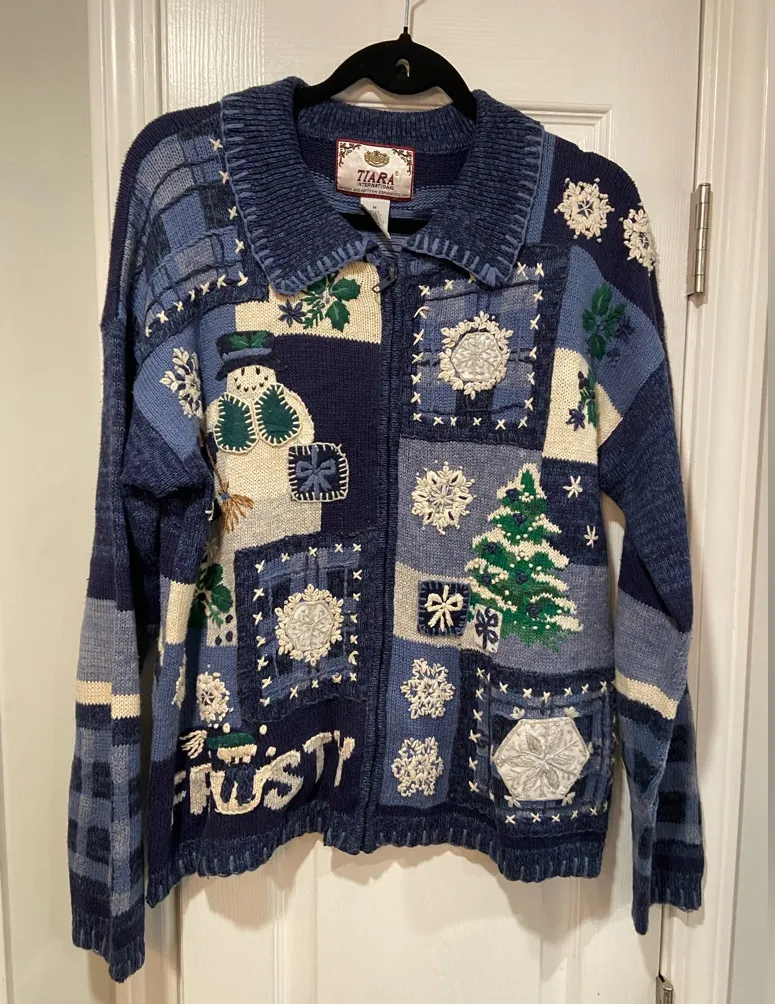 Tiara International Womens size medium Good vintage condition Vintage 2001 long sleeve collared full zip cotton ramie patchwork branded embellished frosty the snowman Christmas holiday festive sweater Bring on the holiday cheer with this vintage Christmas sweater crafted in a cozy cotton/ramie knit—perfectly festive, slightly nostalgic, and ideal for the season. Features classic holiday details that make it a standout for Christmas parties, winter outfits, and ugly sweater events. Features: • Vintage Christmas sweater (80s/90s/early 2000s style) • Cotton + ramie knit – soft, warm, textured • Holiday / winter motif: trees, snowflakes, reindeer, ornaments, Santa, etc. • Chunky knit / detailed embroidery • Perfect for holiday photos, Christmas morning, office parties, and ugly sweater contests vintage Christmas sweater, cotton ramie sweater, holiday sweater, festive knit, ugly Christmas sweater, 90s sweater, Xmas pullover, embroidered holiday top, vintage winter sweater, Christmas party outfit, novelty sweater, classic holiday knit