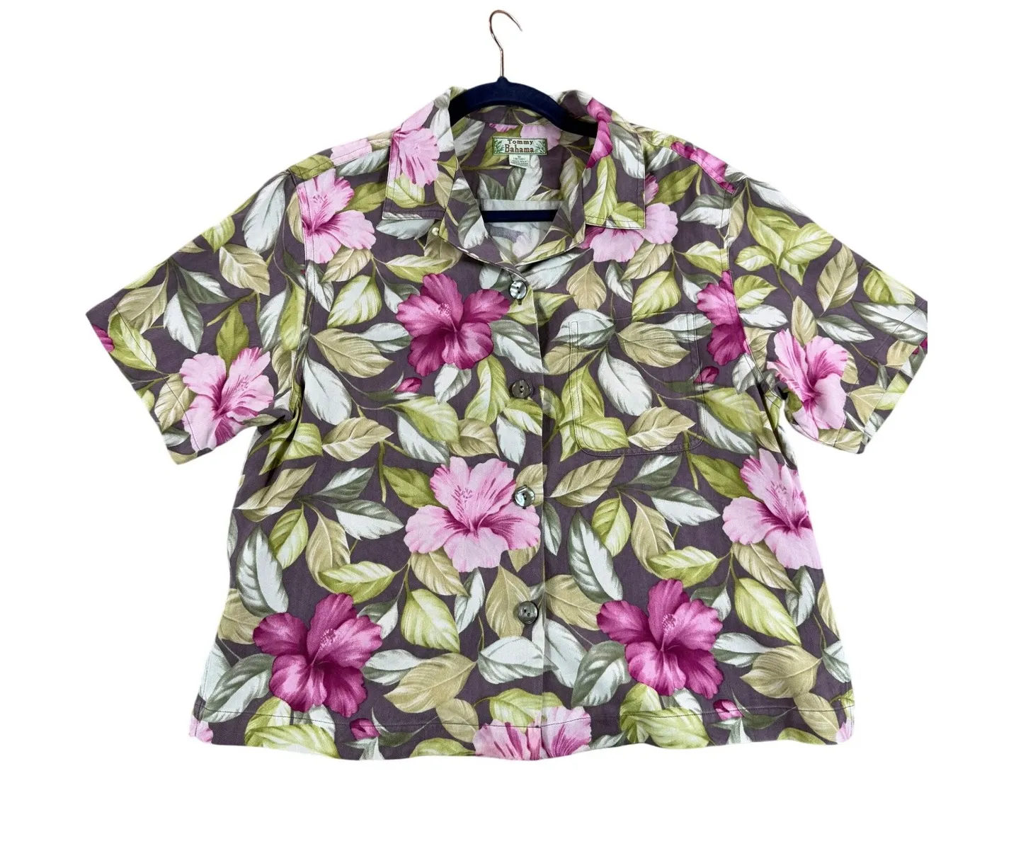 Tommy Bahama silk blouse in a captivating purple and pink floral print. This short sleeve top featu... Show more
