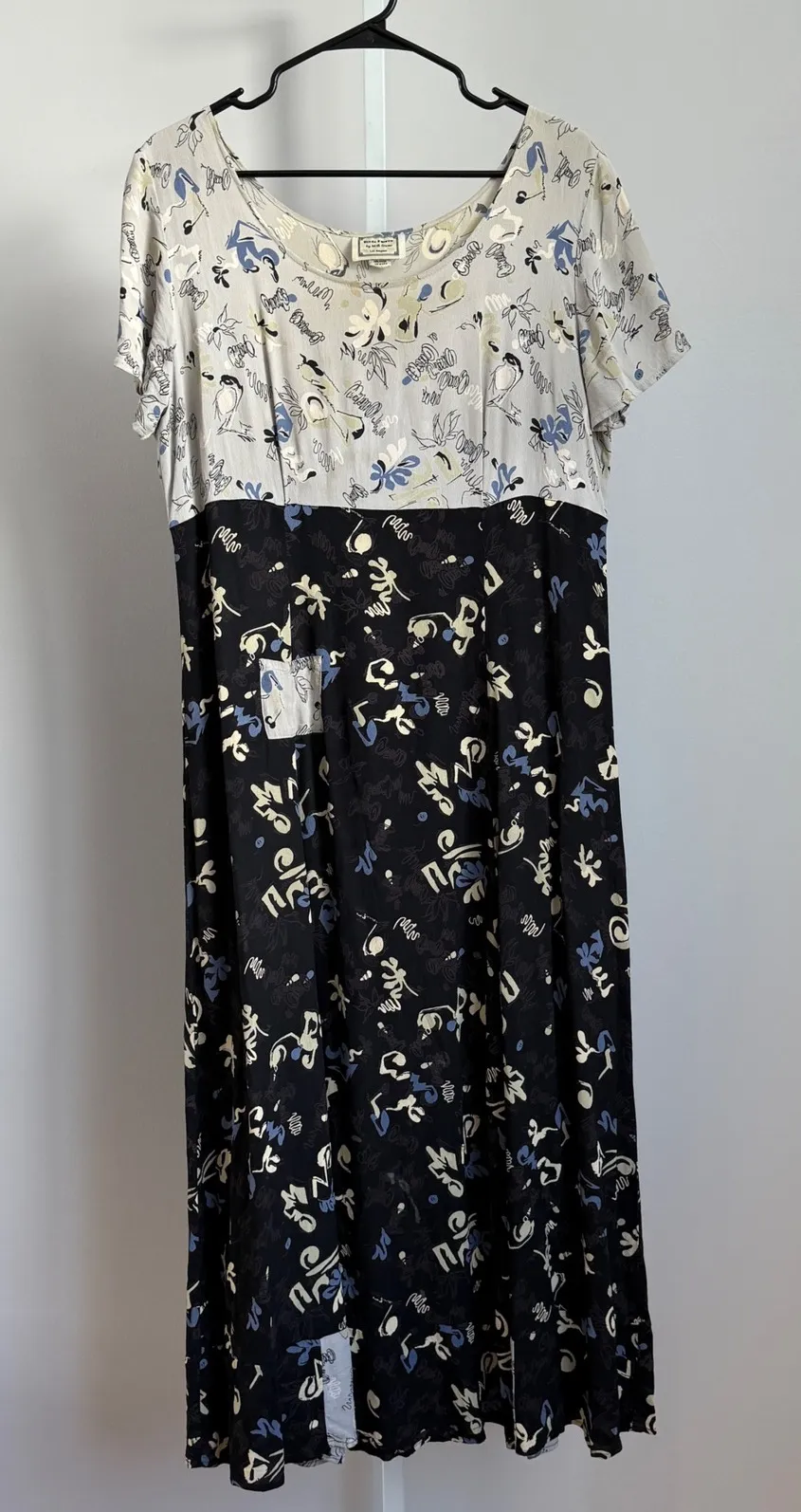 VTG Toots Pierre by MS Snow Floral Maxi Dress sz M/L Lagenlook Wearable Art Keywords: vintage dress, floral maxi dress, Toots Pierre, MS Snow, Los Angeles, rayon dress, M/L dress, black floral dress, beige floral dress, blue floral dress, 90s dress, retro dress, summer dress, lightweight dress, midi dress Gently used with no flaws. Measurements: Pit to Pit: 21" Waist: 38" Hips: 50" Length: 53" Weight: 11 oz SKU: 1D10