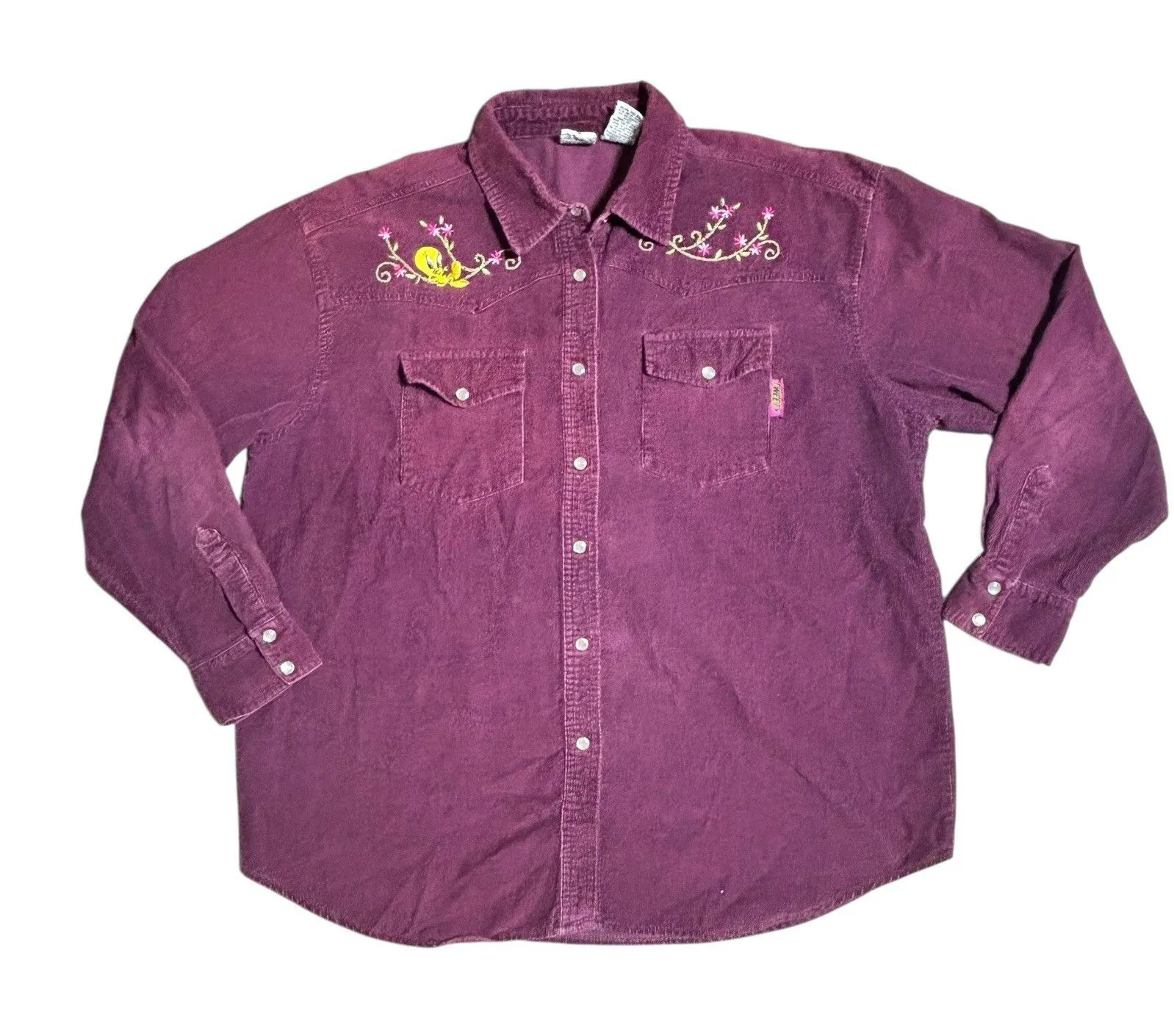 The VTG Tweety Bird Corduroy Shirt for women in size Large is a whimsical and nostalgic addition to any wardrobe. This purple shirt features a pearl snap closure and an embroidered Tweety Bird character design, making it a fun and unique choice for casual or travel occasions. With a collared neckline and long sleeves, this button-up shirt also includes a novel Western theme, perfect for the colder seasons of winter, fall, and spring. Made of comfortable cotton corduroy fabric, this vintage piece from the Looney Tunes brand is sure to stand out and bring a touch of cartoon charm to your outfit. Approximate measurements laying flat Waist Chest 25 Length 29 Sleeve 21 Preowned smoke free