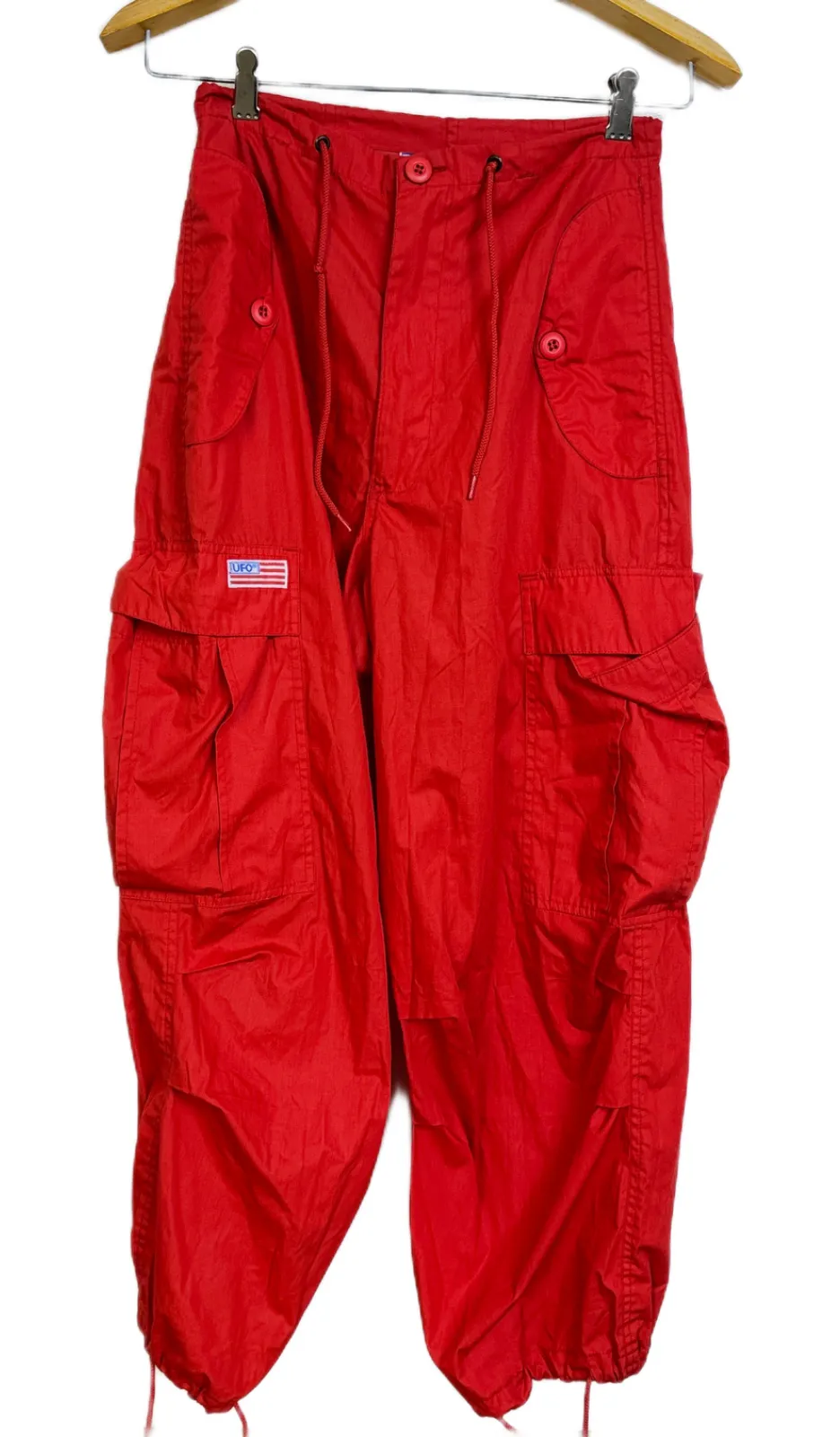 This listing is for a pair a UFO Parachute Cargo Pants. Red. Drawstring at the waist and cuffs. Flag... Show more