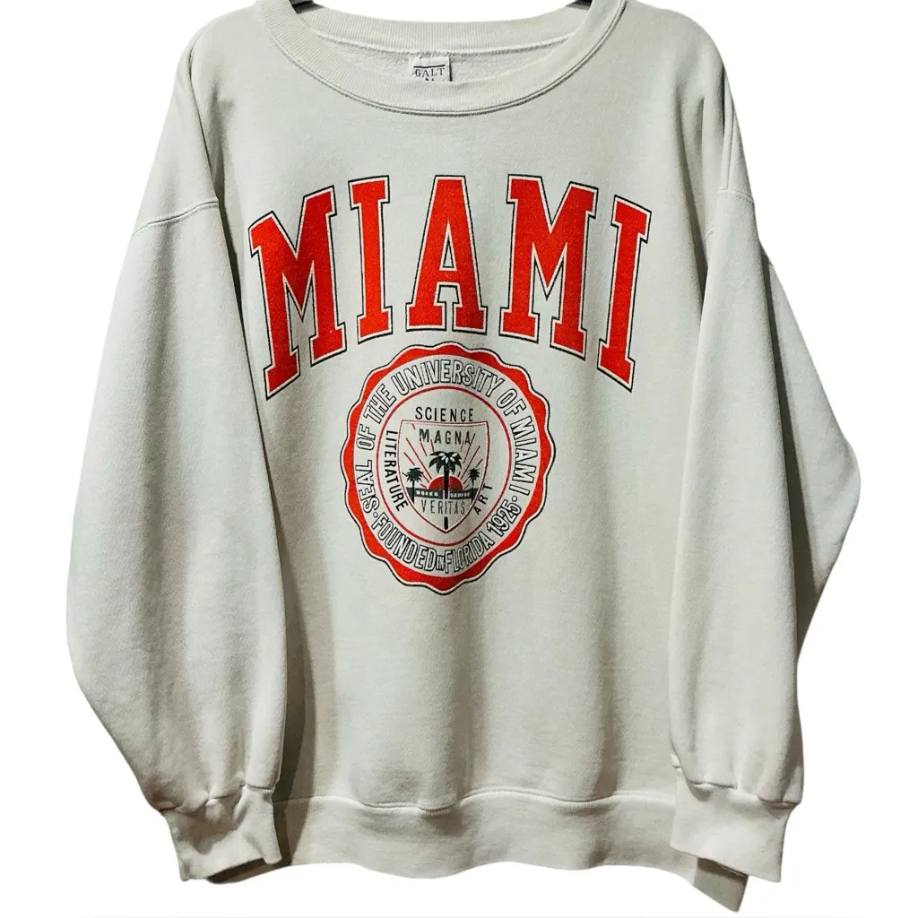 Vintage University of Miami crewneck sweatshirt by Galt Sand, made in the USA. Features the classic collegiate Miami graphic with official university seal and “Science · Magna · Veritas” motto. Soft fleece interior and relaxed oversized fit. There are a few spots here and there, but they really give it character and add to the authentic vintage feel. Measurements: • Across chest underarms: 25” • Length: 38” ⭐️⭐️Trusted seller, non-smoking home, fast shipping⭐️⭐️