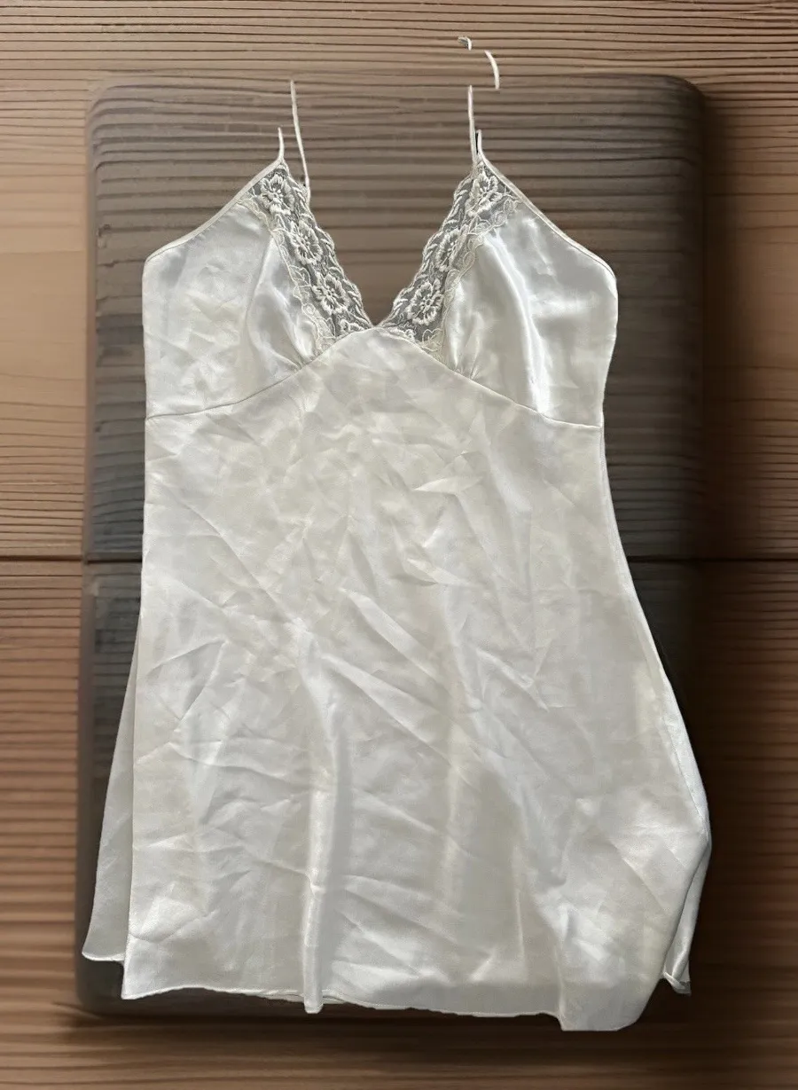 The Vtg Val Mode Slip Dress is a vintage women's ivory chemise made from silky satin fabric. This sleeveless dress features a V-neckline and a pullover closure for easy wear. Ideal for all seasons, the lightweight garment is adorned with a solid pattern and accents with straps, perfect for a boudoir or nightgown look. The dress is machine washable and is designed with a Barbie and fairy character theme, adding a touch of whimsy to your sleepwear collection. Perfect for those who appreciate 90s-inspired, nature-themed lingerie.