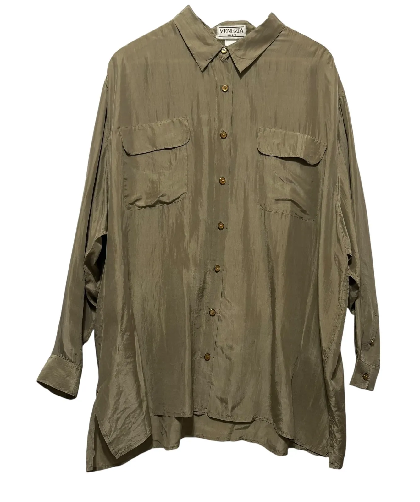 Great Pre-Owned Condition - See Pictures for Details Features: • 100% silk button up shirt by Venezia Vitale • Taupe gray neutral shade with subtle sheen • Oversized relaxed fit with drop shoulders • Dual front flap chest pockets • Long sleeves with button cuffs • Timeless quiet luxury piece perfect for work, brunch, or layering Style Profile: old money, minimalist, elevated casual, capsule wardrobe, vintage style Approximate Measurements: flat lay: (Vintage sizing may be different from modern. Please check measurement below.) armpit to armpit: 29" length: 31" Pet/smoke free home 1-2 day shipping Bundle & Save