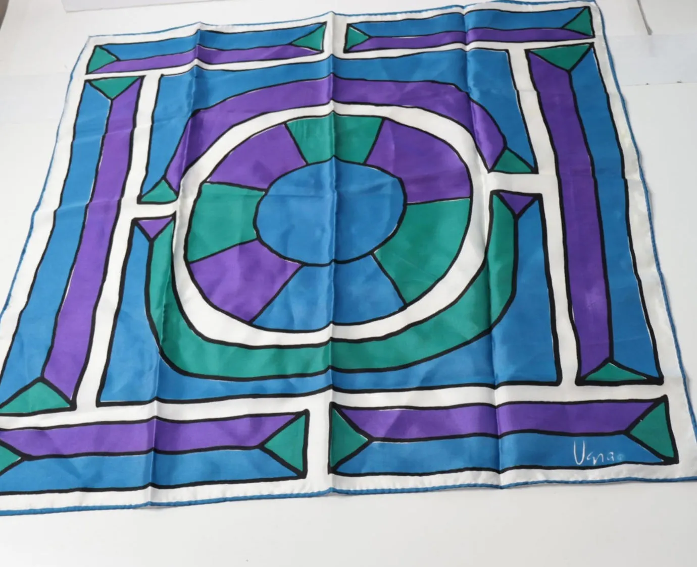 VTG Vera Neumann 22" Square Scarf Rolled Edge Geometric Abstract Art Colorful vintage retro multicolor green purple green white bandana handkerchief 80s made in Japan acetate artsy designer Good preowned condition. Please see photos for details.