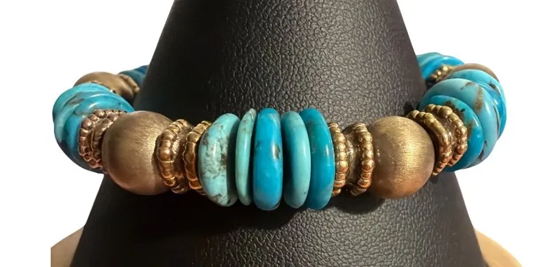 This vintage Veronese bracelet, crafted in Italy, features a stunning combination of 925 sterling silver, turquoise beads, and gold vermeil. A unique estate find weighing 32.32 grams, it is perfect for adding elegance to any outfit. • Vintage Veronese bracelet • Made in Italy • 925 sterling silver • Turquoise beads • Gold vermeil finish • Estate piece • Weighs 32.32 grams • Elegant design • 6.5-inch length Excellent preowned condition