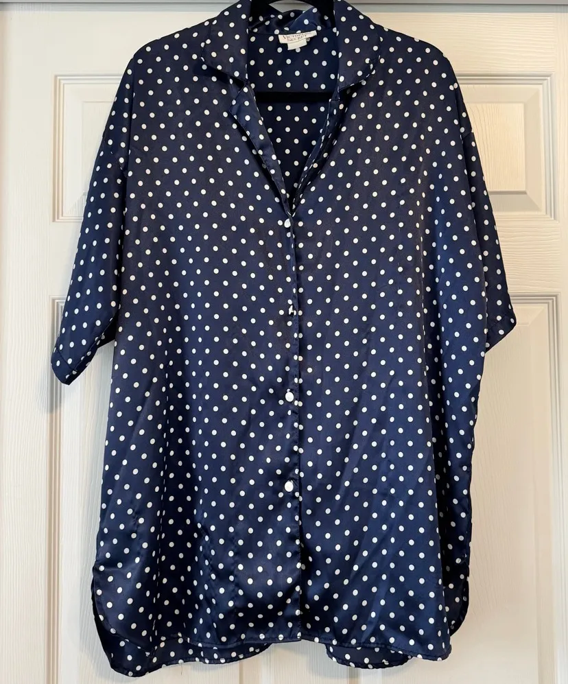 Vintage Gold Label Victoria's Secret women's top featuring a navy blue satin-like fabric with white... Show more