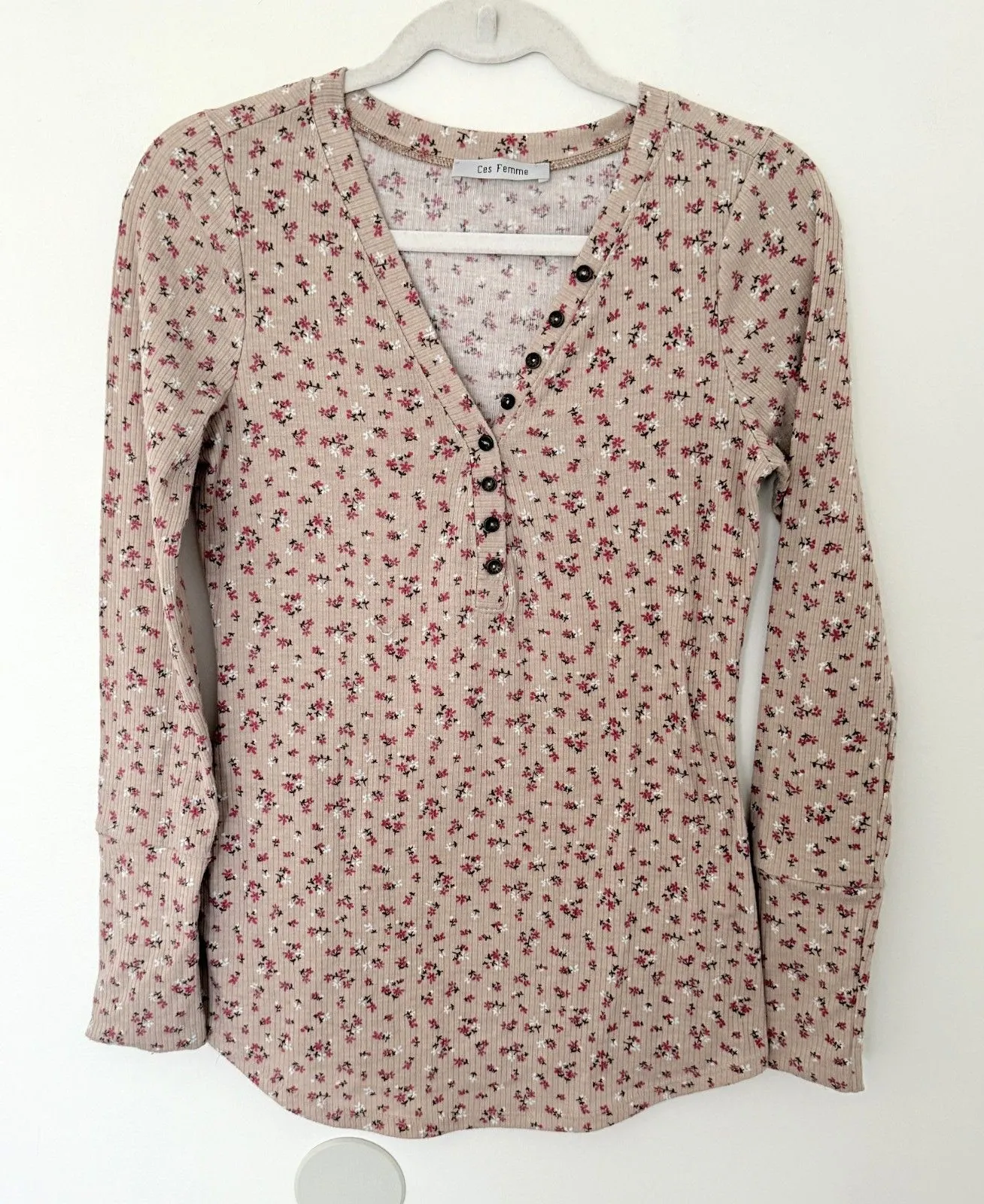 Vintage Y2K Ces Femme ribbed henley top in a playful floral print. Stretchy long sleeves and soft fa... Show more